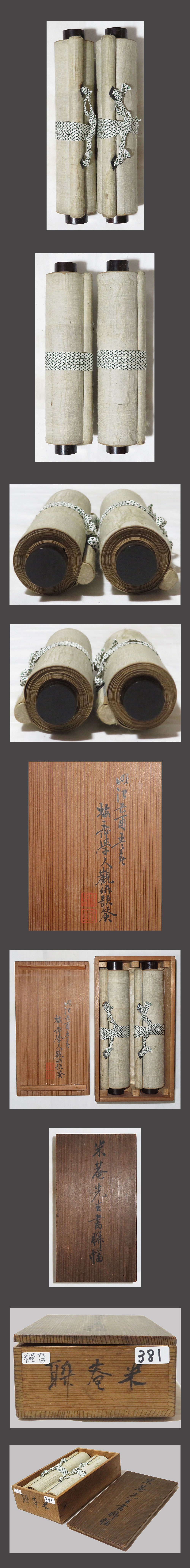 【左側掛軸】 肉筆、真作保証。 作品に、時代感、シミ、汚れ、多数の強い折れ、 巻きじわ、多数のスレ、傷んでる箇所があります。 表装に、時代感、シミ、汚れ、多数の折れ、巻きじわがあります。 【右側掛軸】 肉筆、真作保証。 作品に、時代感、シミ、汚れ、多数の強い折れ、巻きじわがあります。 表装に、時代感、シミ、汚れ、多数の折れ、巻きじわがあります。 表装裏側に、経年によるシミ、汚れ、多数のスレ、傷んでる箇所があります。 箱は水原梅屋の鑑定箱書きがあります。軸先があります。 市河米庵 略歴:美術評価額500万、名は三亥、字は孔陽、通称は小左衛門、 雅号別号米庵、楽斉、小山林堂、百筆斉、金習山人、江戸、師系市河寛斉、 生没年安永7年(1778年)~安政4年(1857年)享年80才没。 水原梅屋 略歴:(1835-1893) 幕末-明治時代の漢学者。天保6年生まれ。 大坂の人。鴻池氏の支族山中朔之助の子。広瀬旭荘に師事し, 詩文,書画をよくした。維新後,大阪若松町に私塾をひらく。 明治26年12月20日死去。59歳。名は耕豊。字は士明。別号に凝香。 下記の真作保証について・注意事項をよくご覧の上、 お気に召された方に、お譲り致しますので、ご入札を宜しくお願い致します。 |