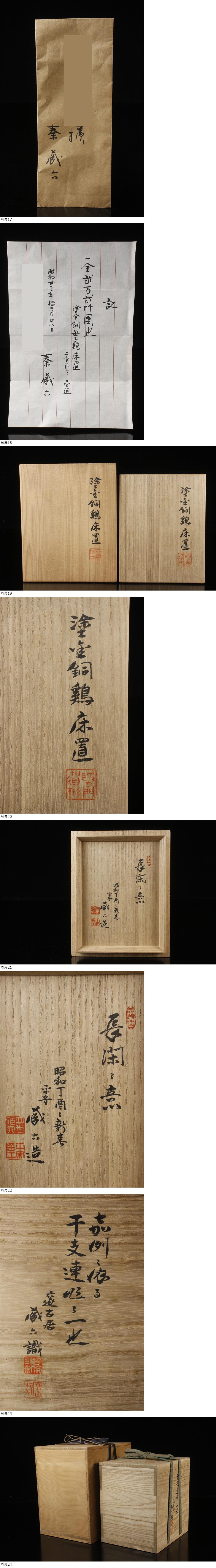 ⑥ 25121801* * * 商品詳細 * * * ここでしか出逢うことのできない唯一の美をご紹介させて頂きます。 四代秦蔵六による応需作品 干支連作の一点、鶏床置です。 長閑かながらもどこか張り詰めたものがあり、 柔らかな羽毛に包まれた逞しい体つき、鋭い目つきに自然の厳しさと力強い生命が感じられます。 雛たちは愛らしく、母鶏は雛たちを守るかのように警戒心をあらわにした緊張感ある姿で表されており、 母の大きな愛と強さが伝わって来る表現が見事です。 鍍金の鮮やかな輝きも素晴らしく、臨場感のある造形をより美しく引きたてます。 作者の高い技術と表現力が遺憾なく発揮された貴重な作品を この機会に是非お手元にてご堪能下さい。 四代 秦蔵六 1898年 生まれ 二代秦蔵六に師事 技術保存資格者 京都金属工芸協会長 1984年 逝去 ■商品内容/置物、共箱、二重箱 ■サイズ/横16.5cm×高16.5cm×奥行8.5㎝ 横5.5cm×高5cm×奥行4㎝ 総重量2.6kg 箱:横20cm×高20.5cm×奥行16㎝ 箱:横22cm×高24.5cm×奥行18㎝ ■状態/スレ、小キズ、サビ、箱にスレ、キズ、シミ、潰れがございます。 ※写真にてご確認、ご了承の上ご入札下さい。 * * * 支払詳細 * * * !かんたん決済 * * * 発送詳細 * * * 入金確認後3営業日以内に発送致します。 ※直接引き取りも可能です。 60~160サイズにつきましては 佐川急便、ゆうパックのどちらかで発送いたします。 ゆうパック発送の場合、弊社の発送日から追跡サービスに問合せ番号が反映されるまで 約1日ほどお時間がかかりますのでご了承下さい。 * * * 注意事項 * * * 運送中の破損があった場合は速やかに当社までご連絡下さい。 保険を利用するのに受取連絡後に運送会社による現場での破損状況確認が必要となります。 勝手に返送されますと保険の適用外となりますのでご注意ください。 * * * * * * お問い合わせ:082-236-8669 |