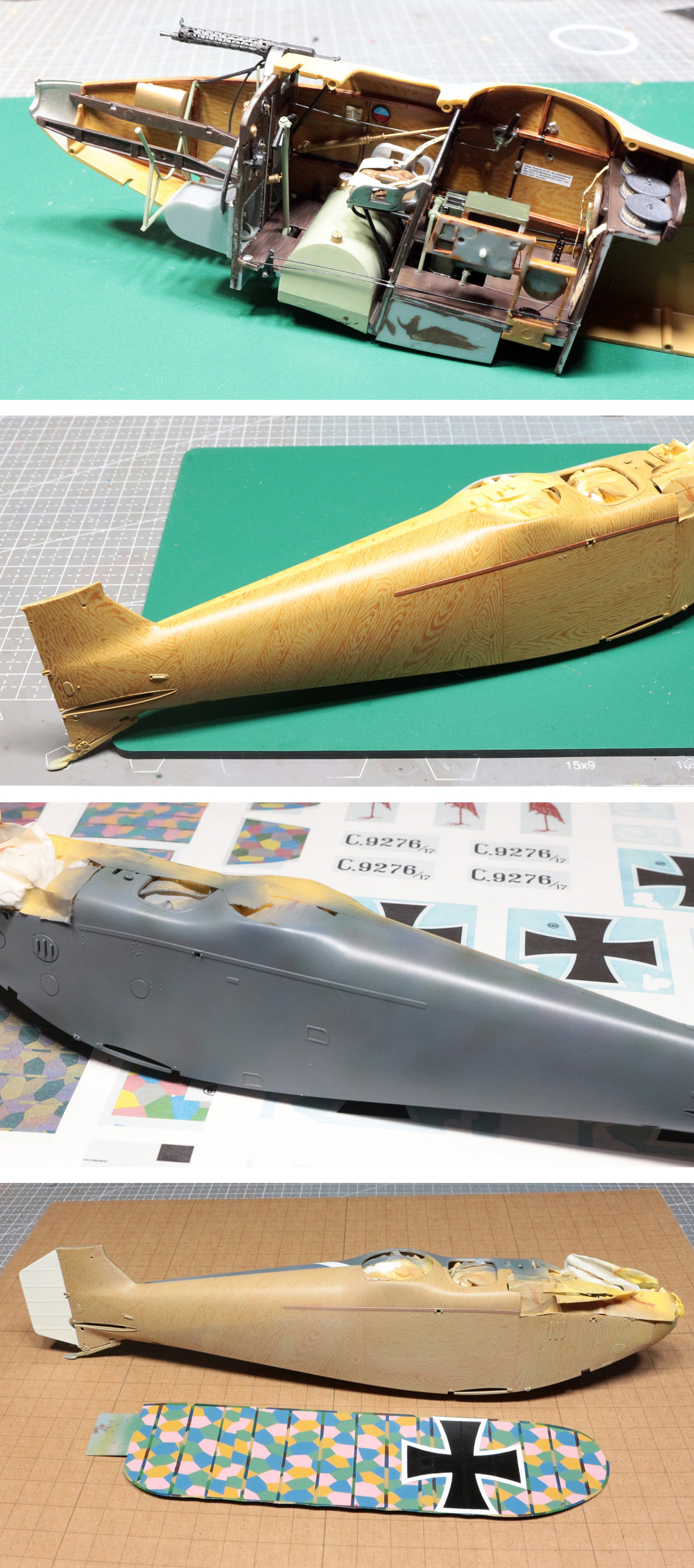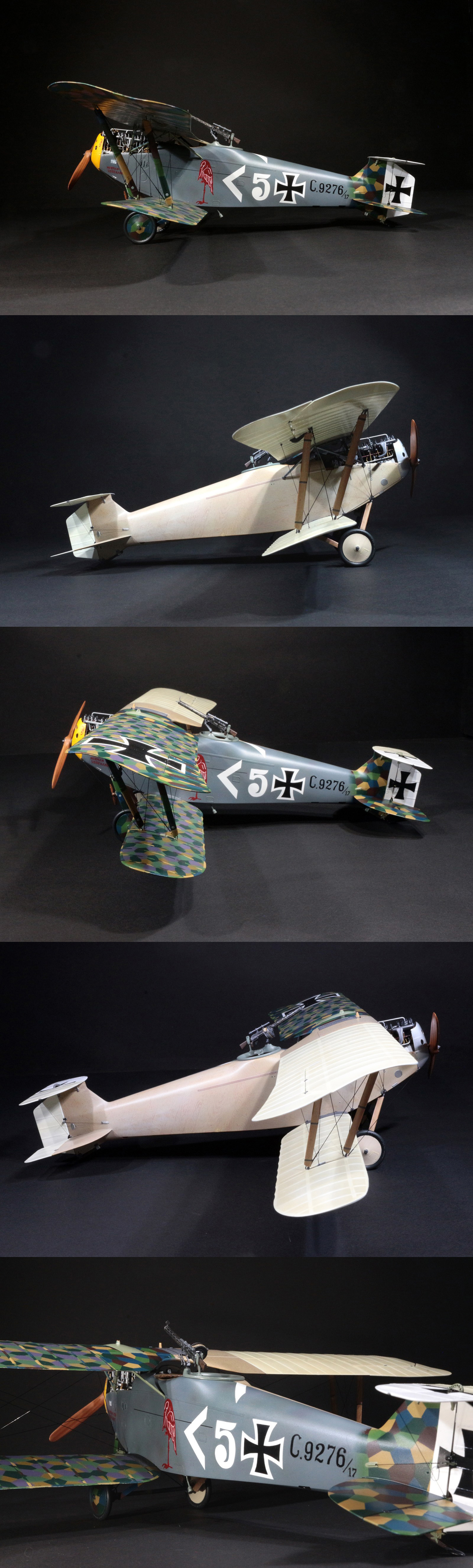 そこで,スターボード側は,木目を描いた上に,ドープ布張りの表現としてクリアホワイト等で「紗」の雰囲気に仕上げました。また通常塗装部はローゼンジ迷彩ですが,この機体は変則的で,合板プランクの上翼中央翼部分と胴体,下側の水平尾翼,リブテープと翼間支柱は5色ローゼンジで,下主翼と上主翼の外翼は4色のローゼンジとなっていました。また胴体は尾部を残して,かすかに下のローゼンジが見える程度に半透明のプルシアンブルー(紺青)で上塗りされていましたが。模型では,プルシアンブルーの上にスポット迷彩のように,下のローゼンジ迷彩の名残を表現してみました。また,翼間支柱は鋼管を芯として,外側に木製合板を翼型に整形したものでカバーされています。塗装にはタッチアップの跡があります。