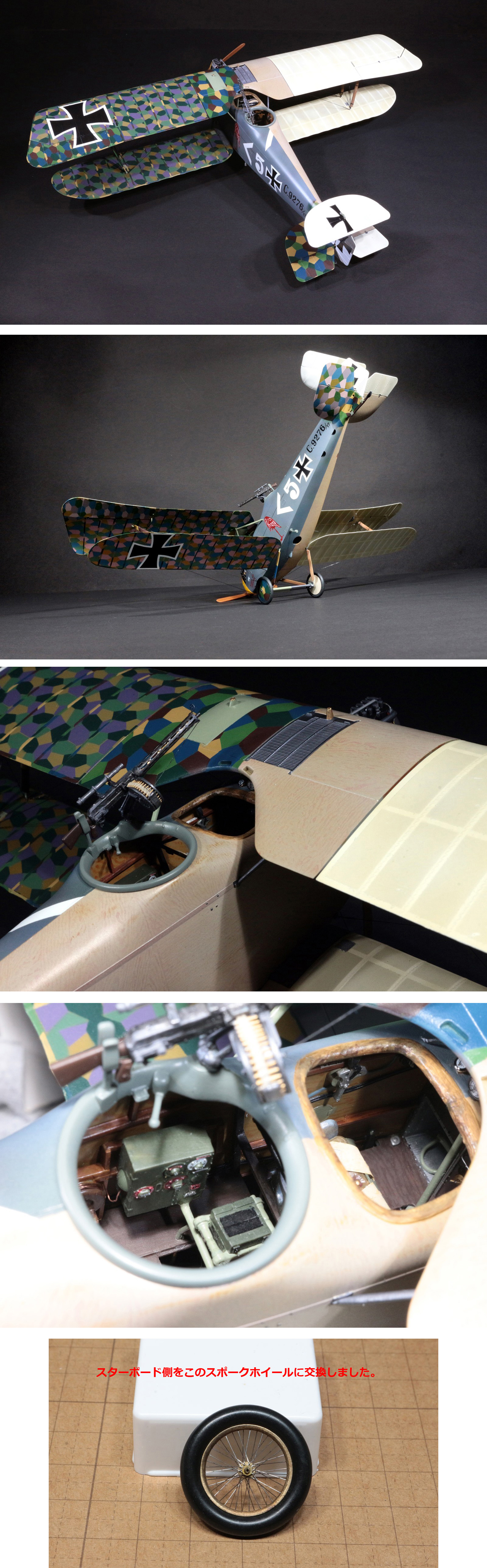 エンジン周りを中心にディテールアップしています。エンジンは上部カウリング(カバー)を外した状態にし,カバーも塗装したが,干渉物があるので取り付けは出来ません。また,撮影の関係で内部写真がありませんが,偵察用カメラが後部座席に設置された状態で仕上げました。また撮影後に,スターボード側の車輪を知り合いのモデラーがハンドメイドしたスポークドホイールに交換しました。