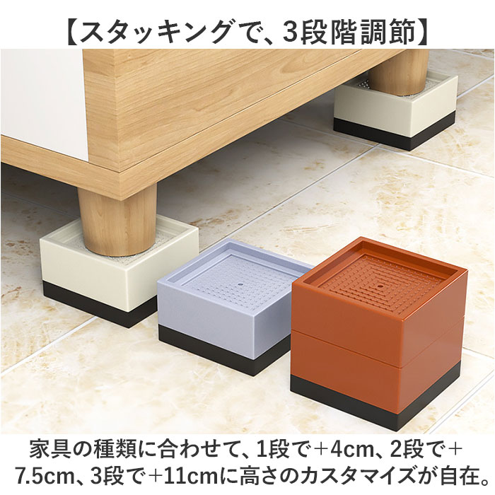 | 商品説明 | ・・【テーブルやベッドの高さ調節が自在】 ・家具の高さを“ちょい上げ”して、より暮らしやすく!取り付け簡単「継ぎ脚 3段調整 4個セット」 ・【スタッキングで、3段階調節】 ・家具の種類に合わせて、1段で+4cm、2段で+7.5cm、3段で+11cmに高さのカスタマイズが自在。 ・【勉強やテレワークの効率がUP!】 ・デスクの高さを調整して姿勢改善や目の疲れ防止に。お子様の成長に合わせて勉強机の高さUPにも。 ・【ロボット掃除機で家事が時短に】 ・ベッドやソファ下に収納スペースが確保でき、ロボット掃除機がスムーズに通れる高さに楽々調節。 ・【高さを変えて、より身体に優しく!】 ・こたつで座椅子を使いたい時、テーブルセッティングの際に腰を屈めるのがつらい時にも大活躍。 ・【誰でも簡単セッティング!】 ・・1段階~3段階に高さを調整し、滑り止め突起のついた中央の窪みに家具の脚を載せるだけ! ・※家具の脚の直径及び横幅が約7.5cm程度のものまで対応。 ・【重量のある家具でも大丈夫】 ・キングサイズのベッドなど、重厚な家具を置いても大丈夫!耐荷重約500kgの安心設計。 ・【床を傷めず、滑りにくい】 ・底面にTPUゴム製の滑り止めカバー付き。家具がしっかり安定し、床面も傷つけないから安心。 ・【家具に合わせてすっきりコーデ】 ・テーブルやベッド等、一般的な家具の脚を載せて同じカラーでコーディネートできる4点セット。 ・【お部屋に馴染むモノトーンカラー】 ・落ち着きのあるインテリアにすんなり馴染む、シンプルなカラーバリエーションも魅力のひとつ。 |