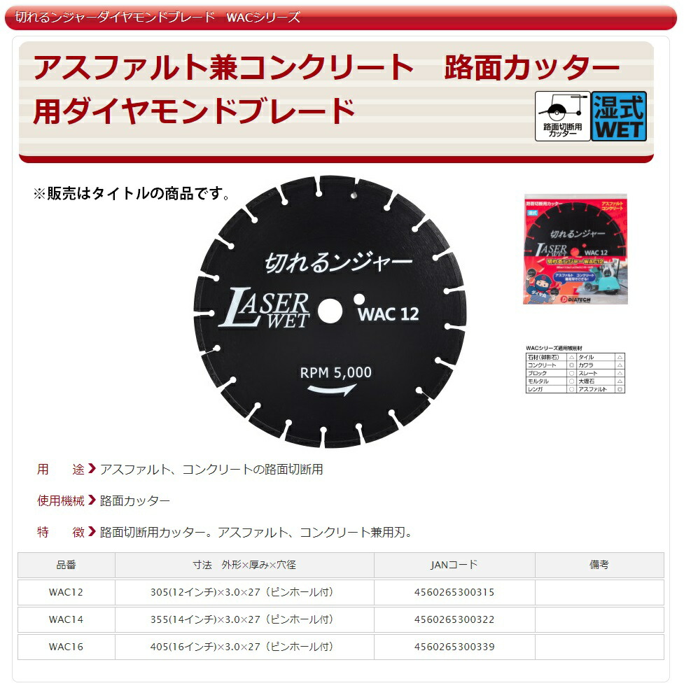 ダイヤテック DIATECH切れるンジャーダイヤモンドブレード WACシリーズ※販売はタイトルの商品です。■用途・アスファルト、コンクリートの路面切断用■使用機械・路面カッター■特徴・路面切断用カッター。・アスファルト、コンクリート兼用刃。