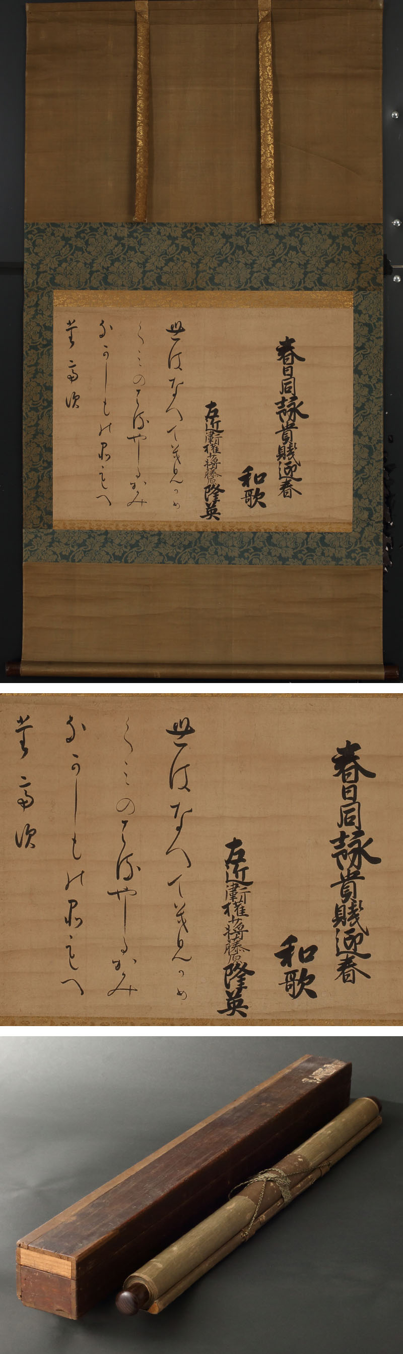 八条隆英の和歌詠草です。 「貴賤迎春」と題し、「世はなべて君がめぐみのたるやしる かみなかしもの品も隔てず」と詠んでおります。位署および歌題より、享保11(1726)年正月24日、中御門天皇の禁裏御会始で詠進された和歌です。 隆英は中御門天皇の叔父にあたり、新家の創設を認められるとともに、天皇の同い年の外戚として永らく信任を受けました。中御門天皇は相次いで父母を喪い、幼時より祖父・櫛笥隆賀(隆英父)が御所の一室を与えられ養育を行っていた関係上、成人しても櫛笥一族の意向が重んぜられ、五摂家が霞むほどの影響力を持っていたといわれます。 隆英25歳、天皇の御代を寿ぐ貴公子の堂々たる逸品です。 ◆八条隆英 江戸中期の公卿。櫛笥隆賀の次男。八条家の祖。姉賀子が東山天皇の後宮にはいり,慶仁親王(のちの中御門天皇)を生んだ縁で正徳5(1715)年八条家をおこす。元文4(1739)年従三位,参議となり,のち権中納言,正二位。宝暦6(1756)年没、55歳。 付属:時代箱が付属します。 寸法:高さ123cm、幅65cm(最大幅。若干の誤差はご了承下さい) 状態:経年のイタミがございます。 |