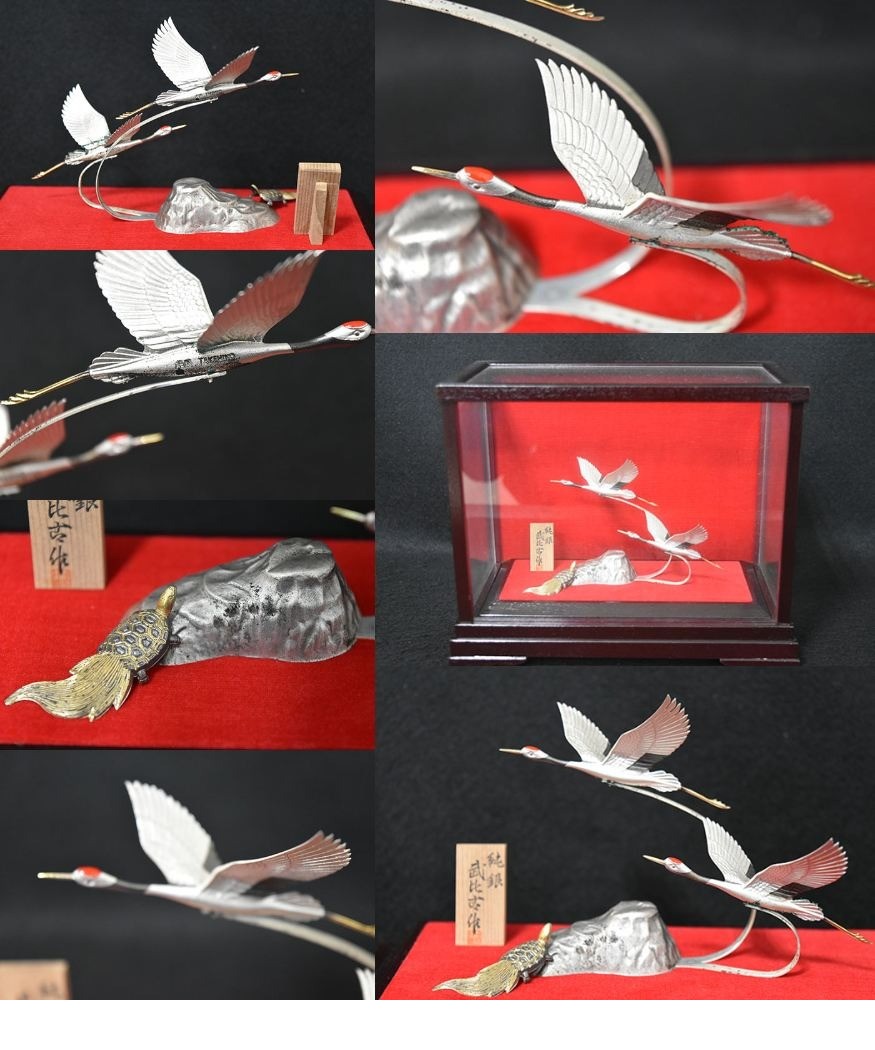 【光成】純銀製「武比古作・鶴亀飾置・純銀と銘印刻有」ガラスケース入