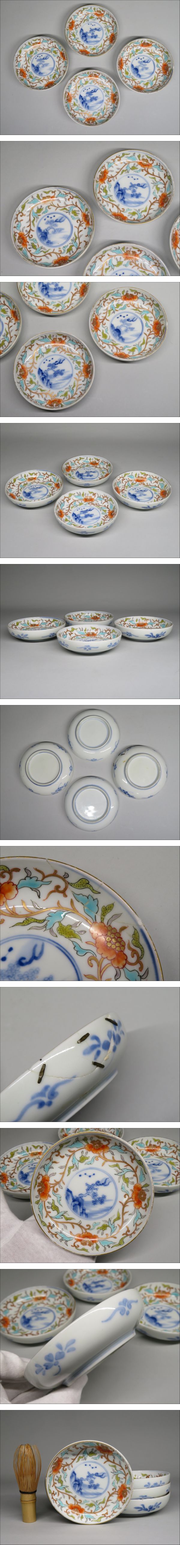 | 「コレクター所蔵品」◆江戸期 古伊万里 染錦 色絵花文皿 4客 ◆検:伊万里焼/有田焼/鍋島焼 | ||