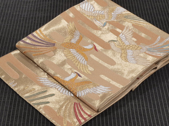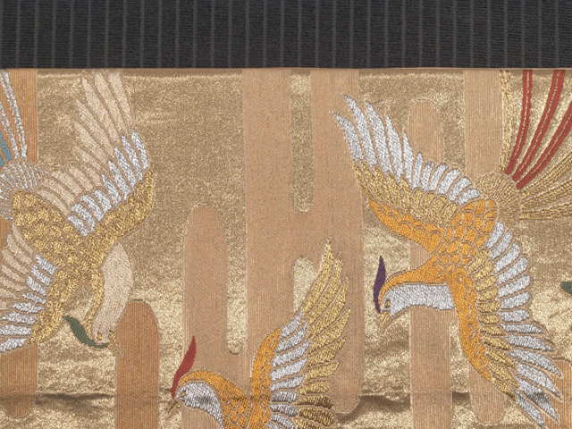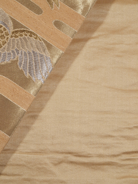 | 詳細 | 全体の印象としては薄金色がかった薄卵色といった感じの地にエ霞と尾長鶏の文様が織り込まれている、西陣織の袋帯です。 翼を広げた尾長鶏に、動きが感じられ、意匠に深みを与えています。おだやかであたたかみのあるお色目が優美な印象です。 ユーズド品で、ごくうっすらとした前の折あとと結びじわはあるほか、手先の裏地に直径約 0.5mm のこまかなよごれが 1 か所あります。そのほかにしみやよごれ、褪色などのダメージは見あたらず、きれいな状態です。 |