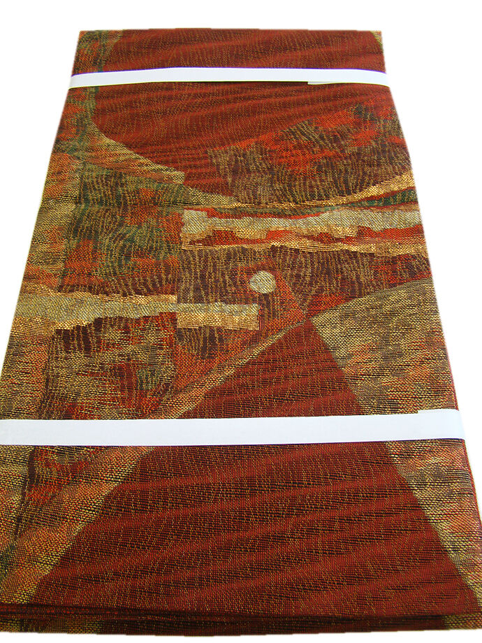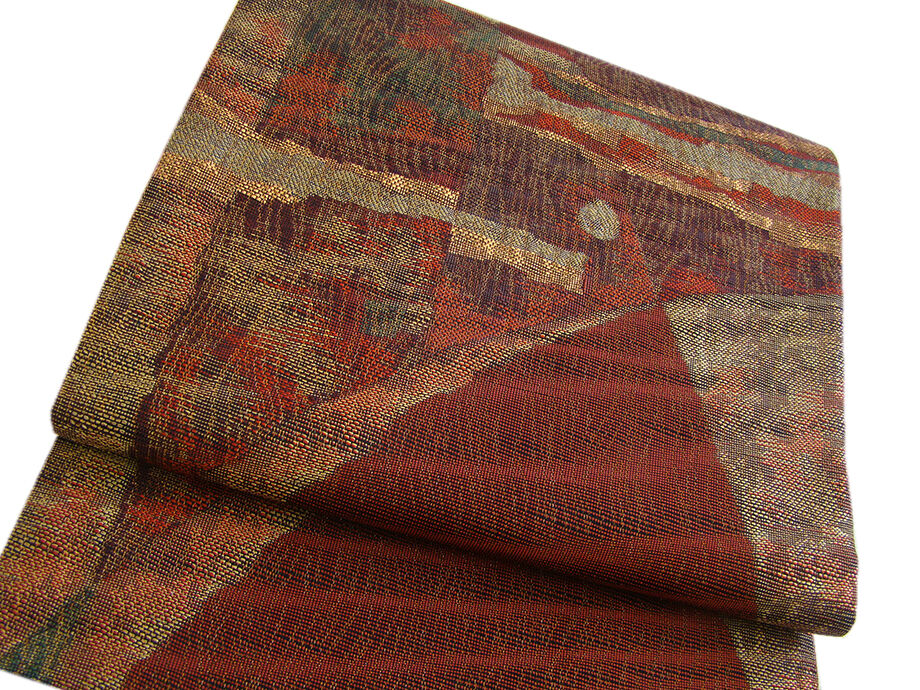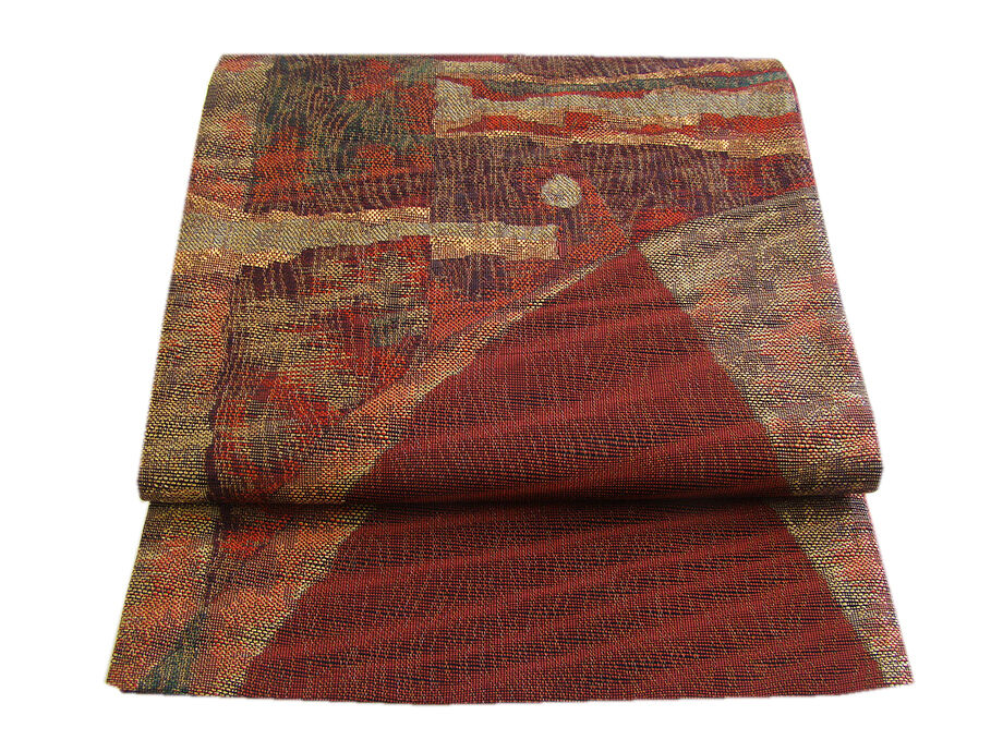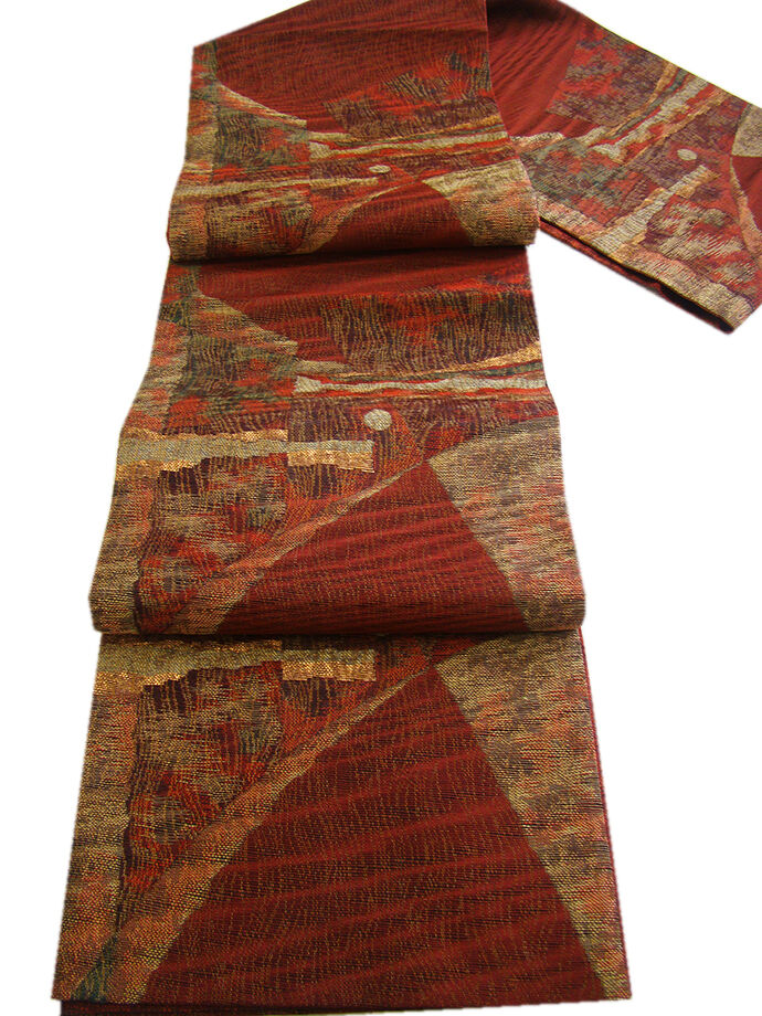 | 商品説明 | とてもしなやかな手触り良い扱い易く結び易い本場筑前博多織の紬地の袋帯。 渋いさつま色泥染の赤茶色地に金糸、緑色等の織柄。 六通柄。 |