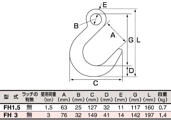 | FH1.5 | なし | 1.5ton | 63mm | 特殊合金鋼 | 0.7 |