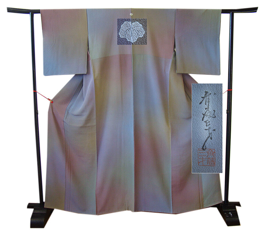 | 商品説明 | こちらのお品は袷でございますので、10月~5月までお召頂ければと思います。 しなやかなぽってりとした手触りの着心地良い重めの極上ちりめん地の生地、 葡萄鼠、青藤、渋い青鈍色等のぼかし染、 八掛は共色(正絹)、背には「蔦」の紋1ヶ、幅広い年代の方にお召頂けます。 作家、「斎藤三才」氏作の落款が入っております。 |
