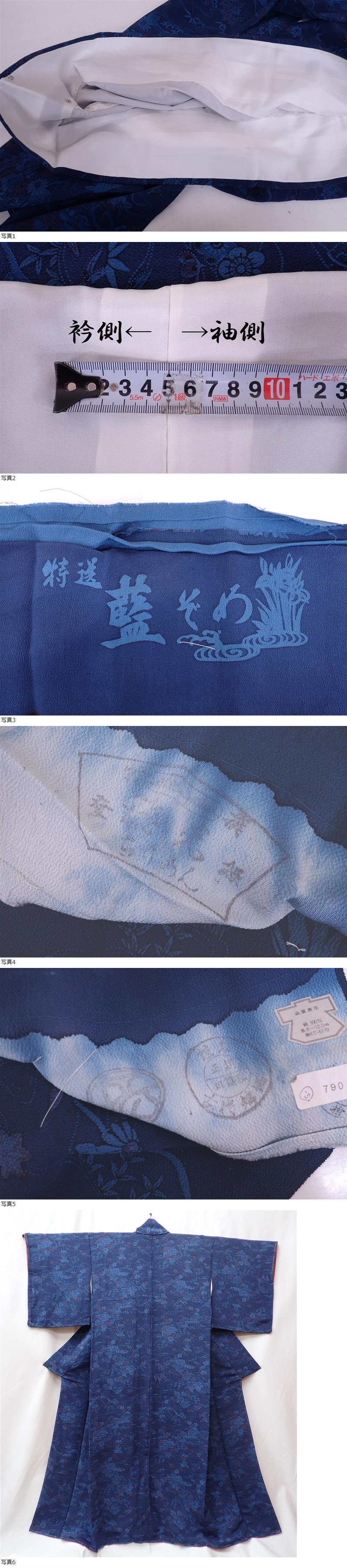特選 藍染め 藍ぞめ 小紋 ちりめん 縮緬 極上 正絹 しつけ糸付き 身丈151cm(+8cm) 裄丈65cm | ||||