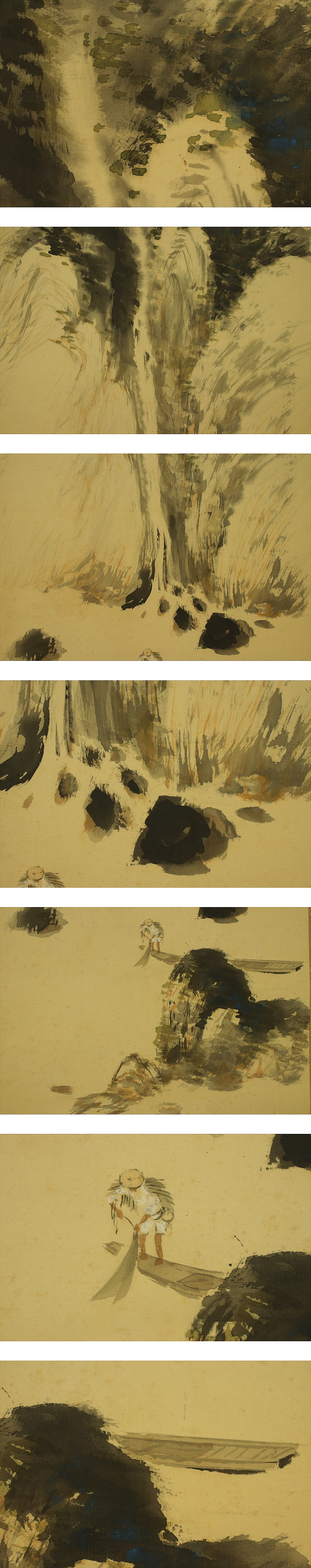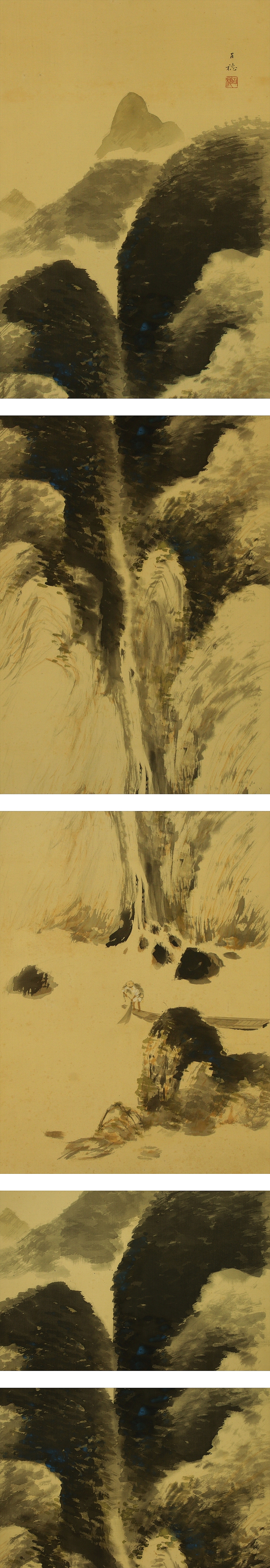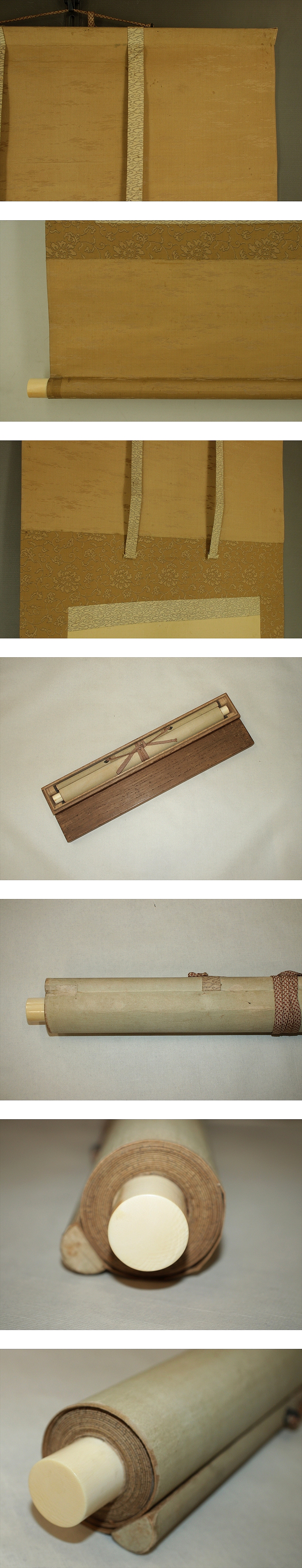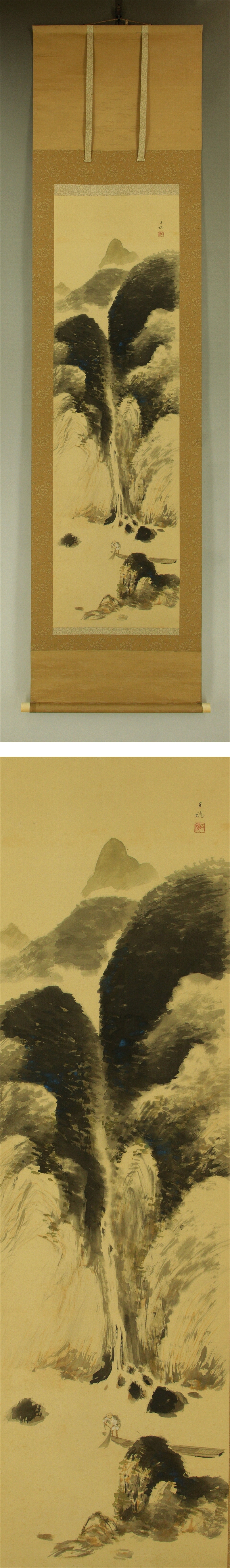 平福百穂 明治10年秋田県生。 名は貞蔵。 幼少より父穂庵に画技を学び、のち川端玉章に師事する。 東京美術学校卒。 結城素明ら同志と无声会・金鈴社を創立。 のちには帝展審査員を務めた。 「アララギ」派の歌人としても知られる。 昭和8年没。 本紙は、染み、汚れ、折れ、皺、ヤケがあります。 表装は、染み、汚れ、皺、虫食、破れ、ほつれ、くすみがあります。 【サイズ】 作品 横約36cm×縦約127cm 表装 横約49cm×縦約202cm |
