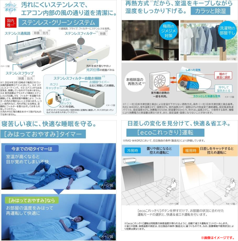 【商品特長】 ◆「凍結洗浄 除菌ヒートプラス」「ファンお掃除ロボ」「カビバスター」搭載、 充実機能スリムモデルのエアコン、Wシリーズの2024年モデル(おもに14畳用)。 ◆本体高さ24.8cmで、今まであきらめていた場所にもすっきり設置できる。 「ファンお掃除ロボ」がファンのホコリを自動で掃除し能力低下を抑制。 ◆「凍結洗浄 除菌ヒートプラス」により、熱交換器の汚れがひどくなる前に自動で洗浄。 「ステンレス・クリーン システム」で内部の風の通り道を清潔にする。 ※動作保証は致しますが、万が一初期不良があった場合の設置に関する 費用等は負担致しかねます。ご了承頂きご購入お願い致します。 | |||||||||||||||||||||||||||||||||||