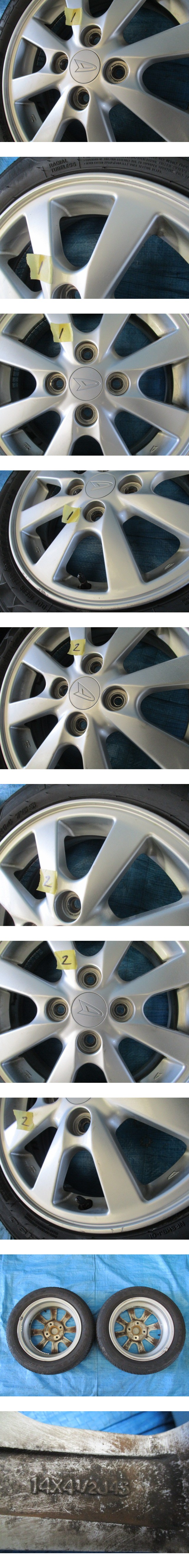 ※下記情報をよくご確認いただいたうえで入札してください。 弊社では「まとめて取引」への対応は行なっておりません。 同梱をご希望の場合はご入札前にご質問下さい。 同梱可能な商品の場合は対応いたします。 また、質問や連絡等なくまとめて購入を選択・決済をされた場合は別途追加の送料をいただくことがあります。 営業日15時までの入金確認で即日発送できます。 日曜日、第2・第4土曜日、祝祭日はお休みを頂いてます。 ■取り外し車両 ●認定型式=DBA-L375S(ダイハツ タント) ●フル型式=L375SGPVF ●年式=2008/09 ●車体番号=0103*** ●走行距離=103,134km ●エンジン型式=KF-VE ●ミッション=4AT ●型式指定/類別区分=16010/0009 ●グレード=カスタムX ●駆動=2WD ■詳細 ・上記車両からの取り外しです。 ・タイヤ付ホイール2本の出品です。 ●タイヤ サイズ 155/65R14 メーカー/銘柄 NEXEN(ネクセン) N priz SH9J 製造年週 2本とも2025年08週 残溝 2本ともに9分山程度 ●ホイール L375タントタントカスタム 純正アルミ(シルバー) サイズ 14×4.5J +45 ハブ径54mm 4H PCD100 ■状態 ●タイヤ 片べりやパンク修理等なく問題なくご使用いただけると思います。 ●ホイール ①リムに1cm×8cmのキズがあります。 ②リムに1cmのキズが3カ所あります。 その他2本ともに、全体的に小キズ・色あせみられます。 曲がりや変形はありません。 ・気持ち良くお使い頂く為、出来る限りの掃除はしています。 ※当方で自動車部品を出品していますので、よろしければ下記のURLよりご覧ください。 team818ys出品リスト⇒https://auctions.yahoo.co.jp/seller/team818ys ■在庫管理番号 2500731-2 ■送料 (元払いのみの対応)運送会社の選択はできません。 [ 北海道 ] 2730円 (北海道) [ 東北 ] 2310円 (青森、岩手、秋田、山形、宮城、福島) [ 関東 ] 2100円 (茨城、栃木、群馬、埼玉、千葉、東京、神奈川、山梨、新潟、長野) [ 中部 ] 2000円 (静岡、愛知、岐阜、三重、富山、石川、福井) [ 関西 ] 1890円 (滋賀、京都、大阪、兵庫、奈良、和歌山) [ 中国 ] 1890円 (鳥取、岡山、島根、広島、山口) [ 四国 ] 1790円 (香川、徳島、愛媛、高知) [ 九州 ] 1890円 (福岡、佐賀、長崎、熊本、大分、宮崎、鹿児島) 沖縄県・離島の方は送料をお問合せ下さい。 最後までご覧頂き有難うございました。ご検討宜しくお願い致します。 | ||||