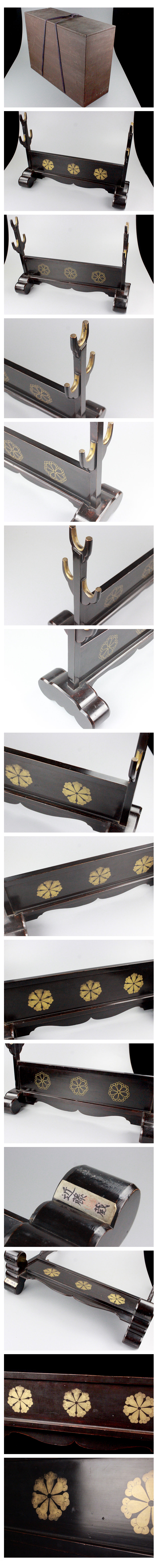 | 【喜楽】七つ丁子紋!! 貴重!! 丁子!! 時代蒔絵家紋刀掛け!! 黒漆時代純木刀掛け!! 両家紋蒔絵!! 木箱!! 112263 | - |