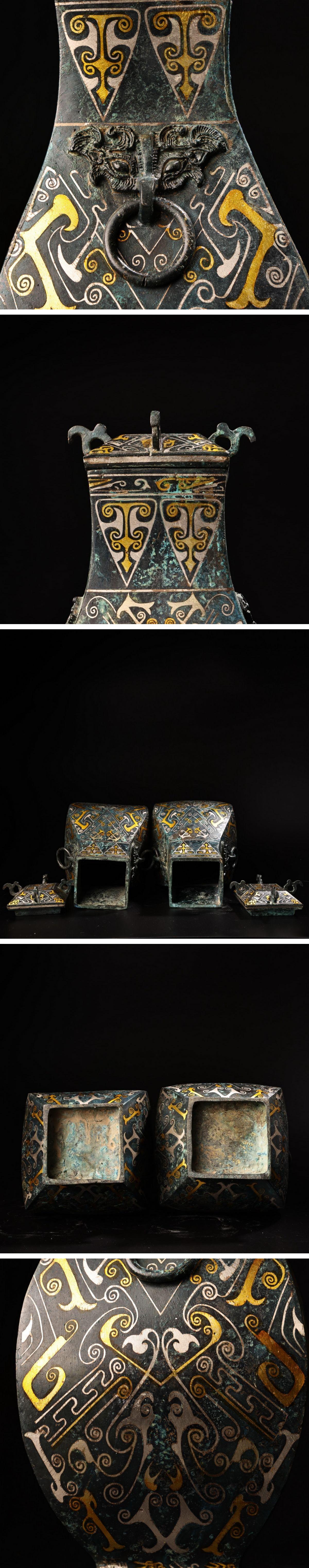 【雲錦】1円から 時代物 ブロンズ象嵌金銀 四方壺一双 古青銅器 時代物保証 材質保証 古美術 骨董品8L19-4WN3