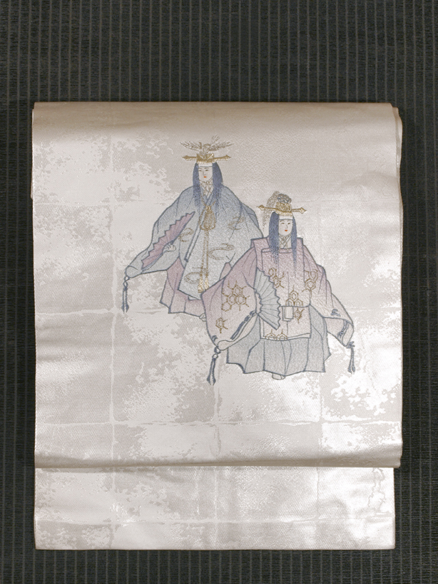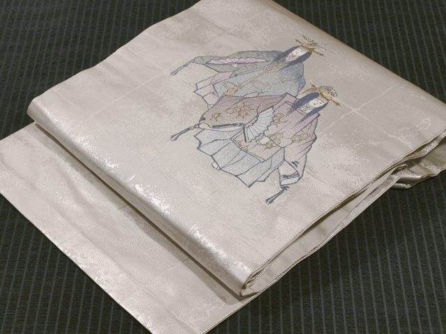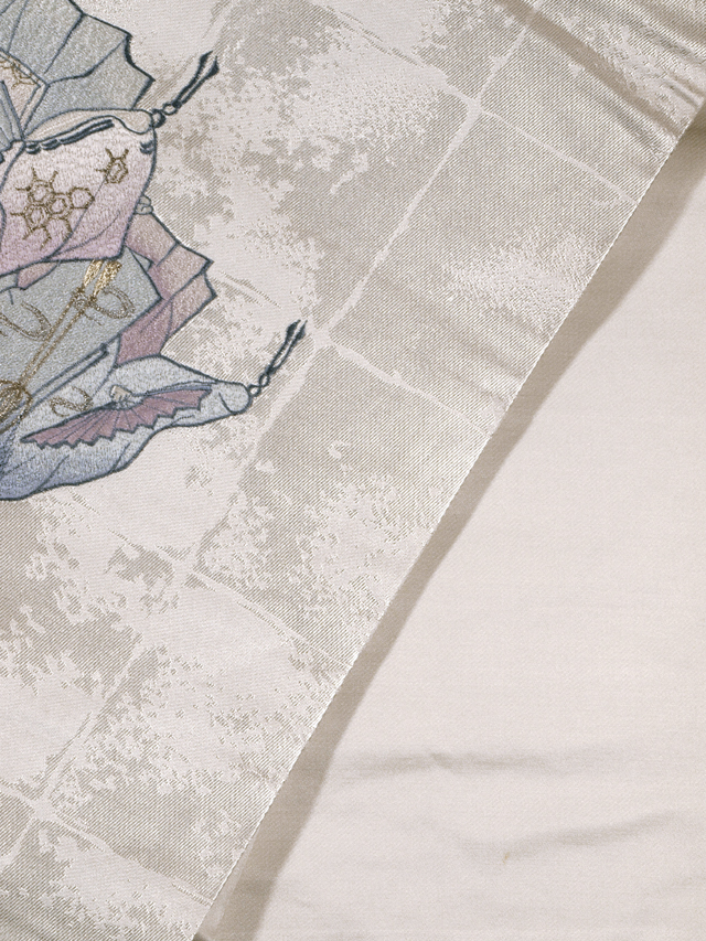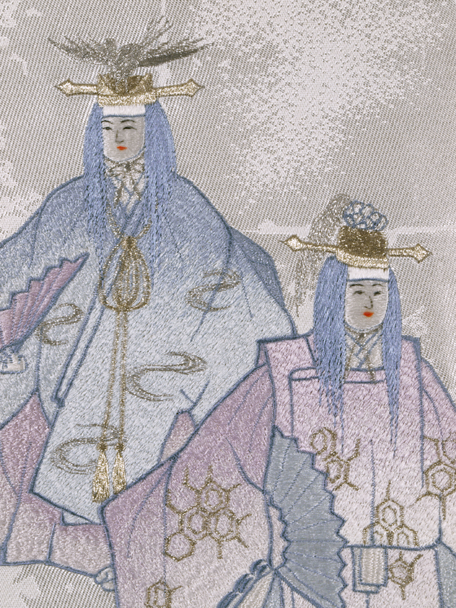 全体的な印象としては白銀色の地に、やぶれ切箔の地紋が織り込まれ、能の「鶴亀」の文様が刺繍で施されている西陣織の名古屋帯です。 とてもめずらしさのある意匠です。装束に配された陰影や文様、鶴亀の冠などが精緻にあらわされています。 ユーズド品で、うっすらとした結びじわがあるほか、胴回りの柄抜け部分に直径約 5mm のうっすらとした黄変が 1 か所、お太鼓の裏地に直径約 5mm-1cm の黄変が 3-4 か所ありますが、ご着用時には隠れます。そのほかに目につく大きなしみやよごれ、褪色などのダメージは見あたらず、きれいな状態です。 |