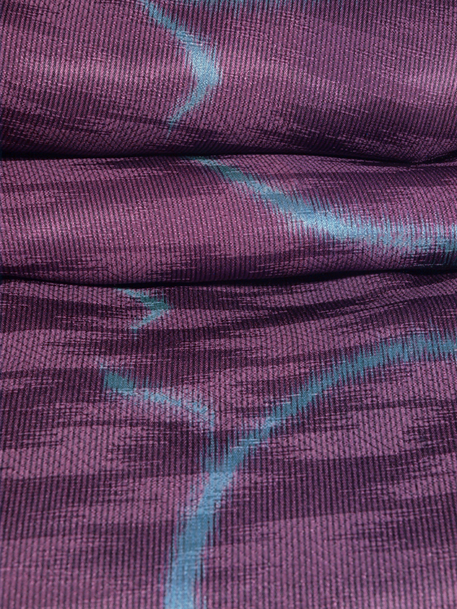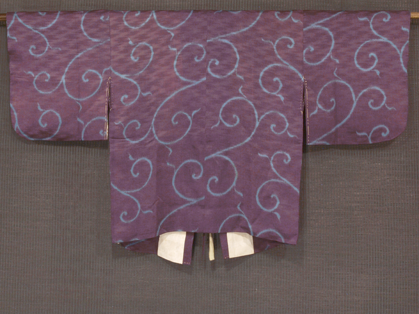 淡い暗紅色(あんこうしょく)の地に、黒色のたて縞と天(あま)色の唐草の文様が染められている縮緬の道中着です。袷仕立てです。 昭和初期ごろにつくられたと思われるアンティークのお品です。のびやかな唐草がアンティークらしい印象です。シボのこまなかな縮緬地です。 右後袖の袖口付近に直径約 0.5-1mm の小穴が 2 か所あるほか、衿裏が黄変しています。そのほかに目につく大きなしみやよごれなどのダメージはありませんが、状態ランク=「D」のご着用対象外、リメイク素材用とさせていただきます。 |