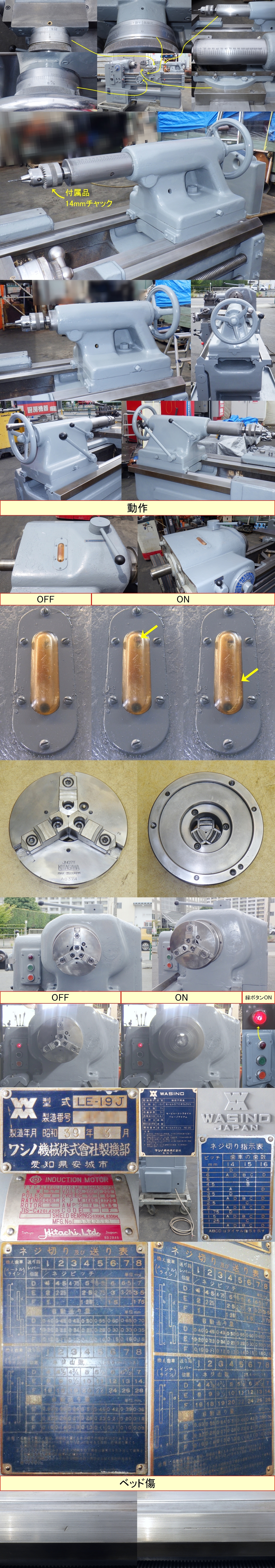 ワシノ製の生産実績10000台越えのLE-19J、6尺旋盤です。