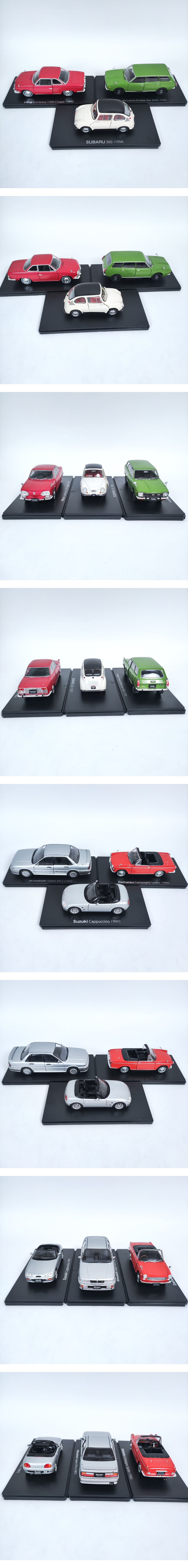 アシェット 国産名車コレクション 1/24 三菱 ギャラン VR-4 (1987) スズキ カプチーノ (1991) ダイハツ コンパーノ スパイダー (1965) 日野 コンテッサ 1300 クーペ (1964) スバル 360 (1958) スバル レオーネ エステート バン 4WD (1972) |
