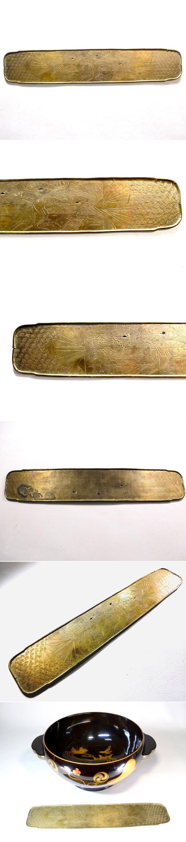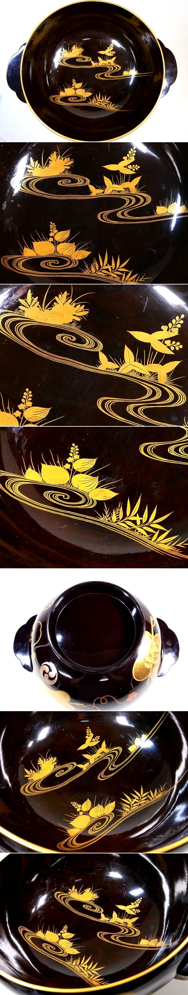 | 商品説明 | ~寸法~ 横幅 約 34.5cm 直径 約 26.2cm 高さ 約 14.2cm 極上金蒔絵の軍配流水草花文に 持ち主の家紋だったと思われる三つ巴家紋が散らされた 豪華絢爛な上級作品クラスの耳盥でございます。 蒔絵一つ一つが丁寧に描かれた 見ていて飽きの来ない生まれの良さそうな作品と存じます。 お好きな方、この機会に是非手に入れて下さい。 ~状態~ 特に気になる傷みはなく状態は良好です。 多少の小キズくらいはございますが 大きく鑑賞を損なう事はないと思われます。 画像にてご確認下さい。 許容範囲内の時代傷みはご理解下さい。 |
