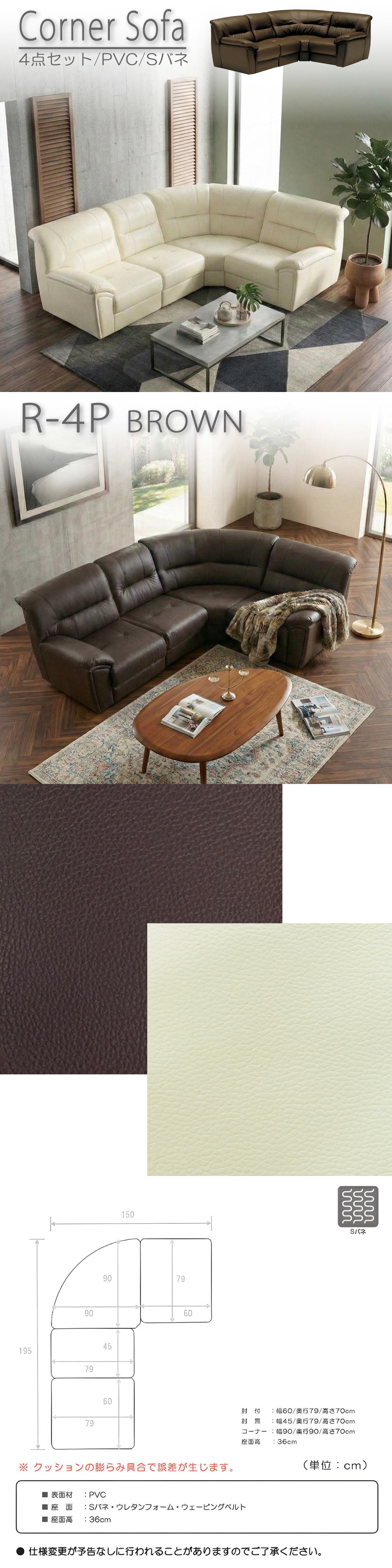 | 特 徴 | シンプルでモダンなコーナー4点ソファーです。リビングをおしゃれな空間に変えます。 張地はお手入れが簡単なPVCとなっております。 ブラウン・アイボリーの2色からお部屋の雰囲気に合わせてお選びください。 | | 商品サイズ | 肘付き:幅 60×奥行 79×高さ 70 (cm) 肘無し:幅 45×奥行 79×高さ 70 (cm) コーナー部:幅 90×奥行 90×高さ 70 (cm) 座面高さ:36cm