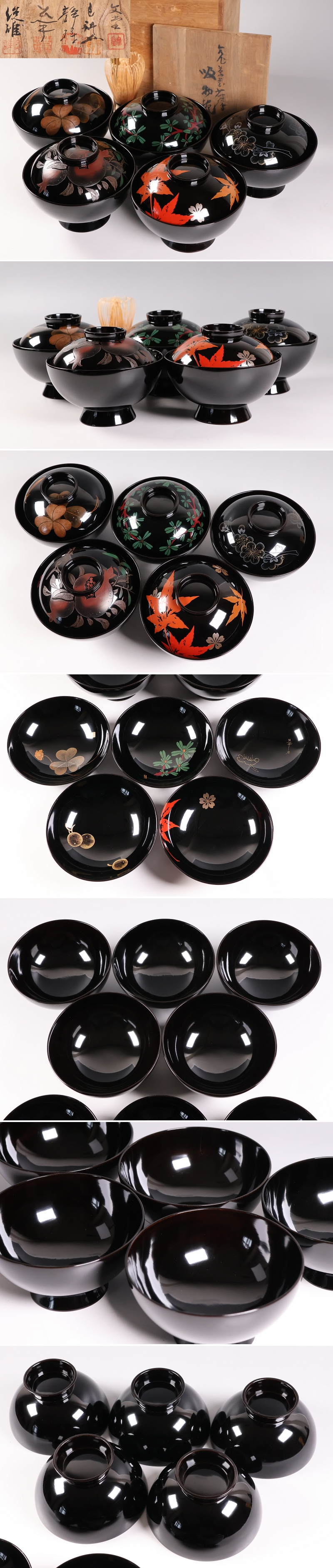 天然木漆塗 輪島塗 絵替わり蒔絵 黒塗 吸物椀 五客