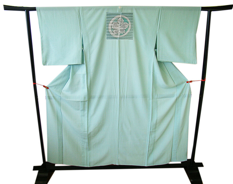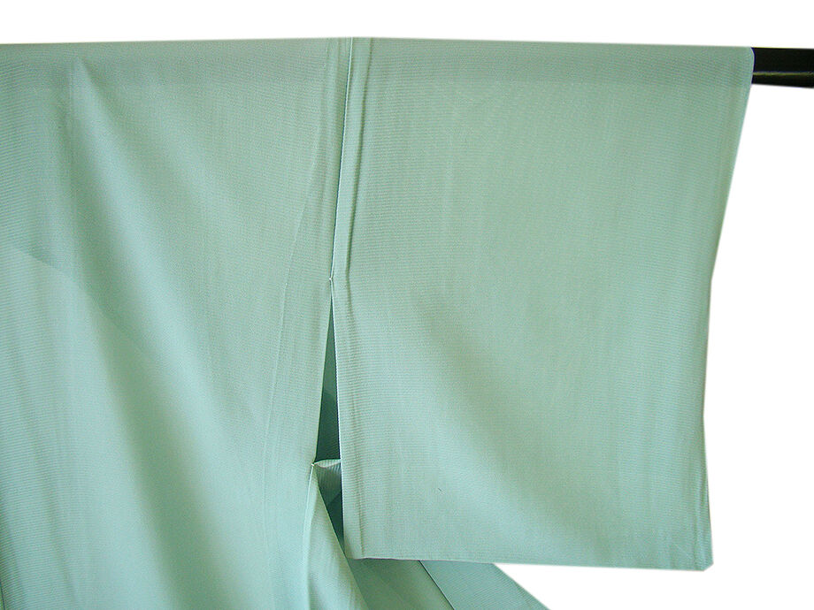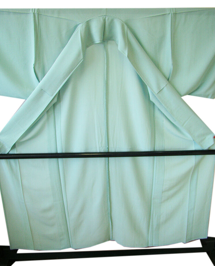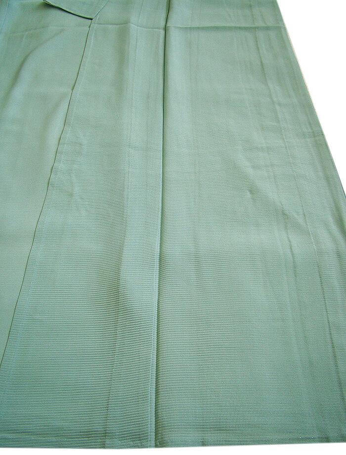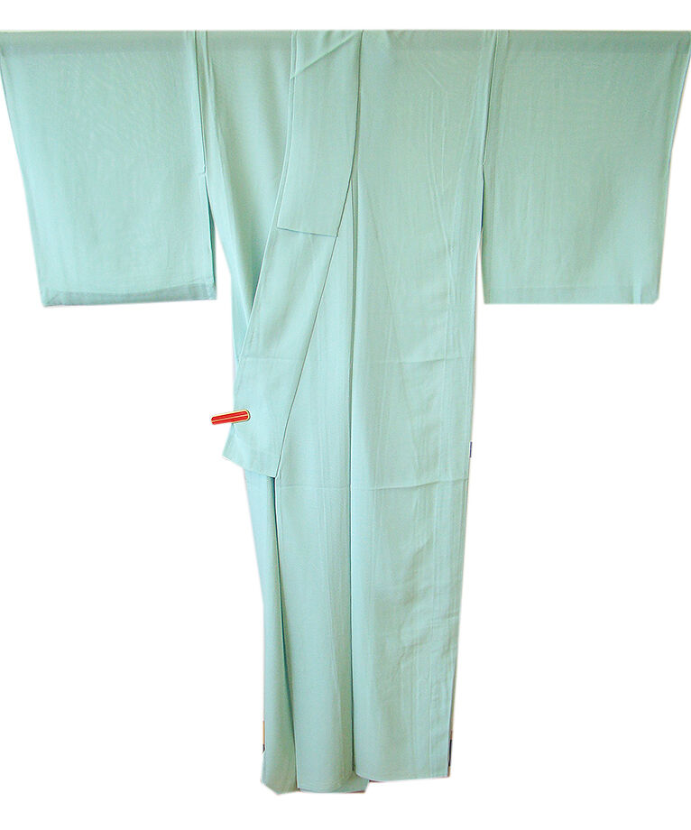 上品な錆青磁色地の色無地着尺、背に紋1ヶ入っております。