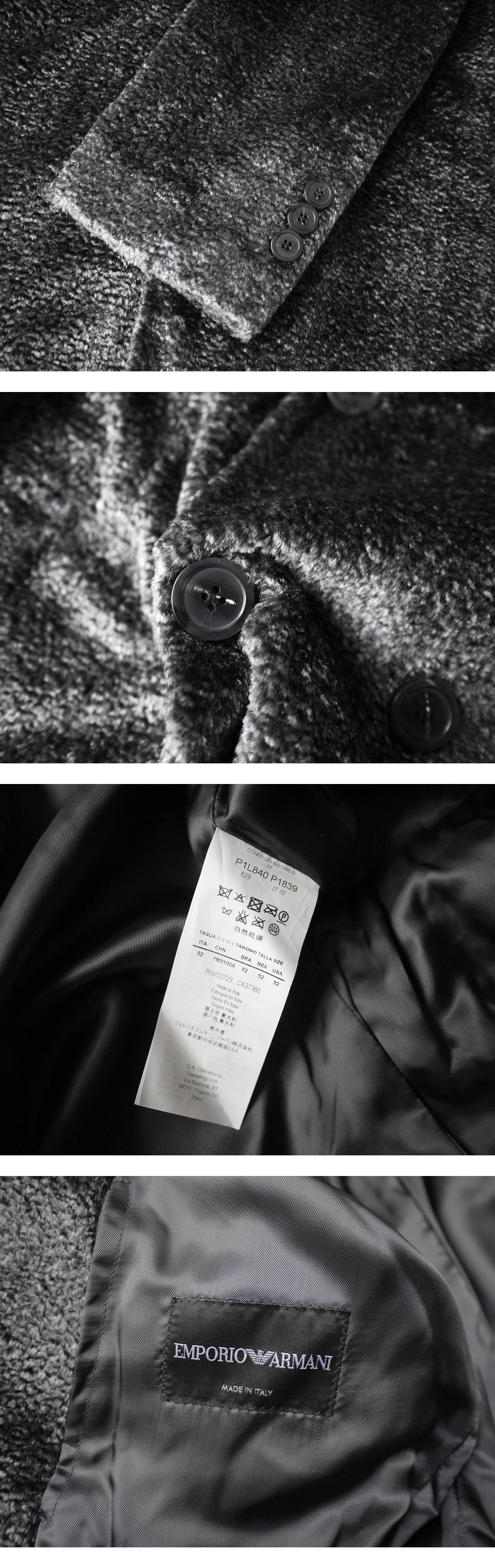 brand EMPORIO ARMANI made in Italy price \350,000(参考上代) material viscose 53% baumwolle 47% color Black サイズ 52 肩幅46 着丈100 袖丈67 身幅54 (多少の誤差はご了承ください。) 状態 使用感の感じられない美品となります。裏地含めダメージは見受けられず末永くご使用頂ける状態です。 |