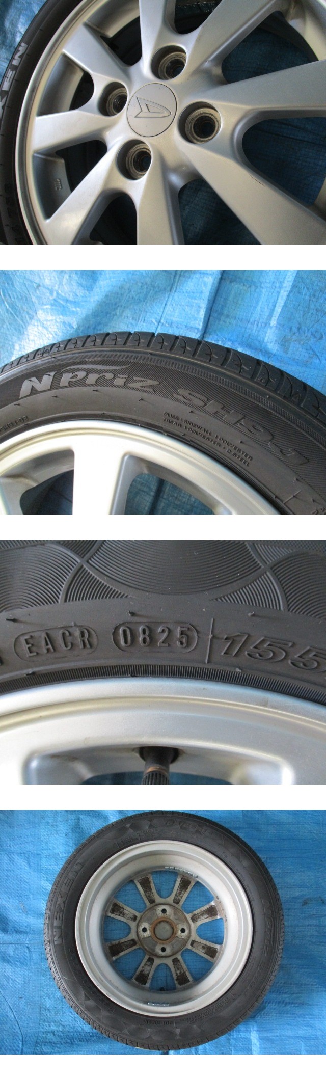 ※下記情報をよくご確認いただいたうえで入札してください。 弊社では「まとめて取引」への対応は行なっておりません。 同梱をご希望の場合はご入札前にご質問下さい。 同梱可能な商品の場合は対応いたします。 また、質問や連絡等なくまとめて購入を選択・決済をされた場合は別途追加の送料をいただくことがあります。 営業日15時までの入金確認で即日発送できます。 日曜日、第2・第4土曜日、祝祭日はお休みを頂いてます。 ■取り外し車両 ●認定型式=DBA-L375S(ダイハツ タント) ●フル型式=L375SGPVF ●年式=2008/09 ●車体番号=0103*** ●走行距離=103,134km ●エンジン型式=KF-VE ●ミッション=4AT ●型式指定/類別区分=16010/0009 ●グレード=カスタムX ●駆動=2WD ■詳細 ・上記車両からの取り外しです。 ・タイヤ付ホイール1本のみの出品です。 ●タイヤ サイズ 155/65R14 メーカー/銘柄 NEXEN(ネクセン) N priz SH9J 製造年週 2025年08週 残溝 8分山程度 ●ホイール L375タントタントカスタム 純正アルミ(シルバー) サイズ 14×4.5J +45 ハブ径54mm 4H PCD100 ■状態 ●タイヤ 片べりやパンク修理等なく問題なくご使用いただけると思います。 ●ホイール 全体的に小キズ・色あせあります。 曲がりや変形はありません。 ・気持ち良くお使い頂く為、出来る限りの掃除はしています。 ※当方で自動車部品を出品していますので、よろしければ下記のURLよりご覧ください。 team818ys出品リスト⇒https://auctions.yahoo.co.jp/seller/team818ys ■在庫管理番号 2500731-1 ■送料 (元払いのみの対応)運送会社の選択はできません。 [ 北海道 ] 2730円 (北海道) [ 東北 ] 2310円 (青森、岩手、秋田、山形、宮城、福島) [ 関東 ] 2100円 (茨城、栃木、群馬、埼玉、千葉、東京、神奈川、山梨、新潟、長野) [ 中部 ] 2000円 (静岡、愛知、岐阜、三重、富山、石川、福井) [ 関西 ] 1890円 (滋賀、京都、大阪、兵庫、奈良、和歌山) [ 中国 ] 1890円 (鳥取、岡山、島根、広島、山口) [ 四国 ] 1790円 (香川、徳島、愛媛、高知) [ 九州 ] 1890円 (福岡、佐賀、長崎、熊本、大分、宮崎、鹿児島) 沖縄県・離島の方は送料をお問合せ下さい。 最後までご覧頂き有難うございました。ご検討宜しくお願い致します。 | ||||