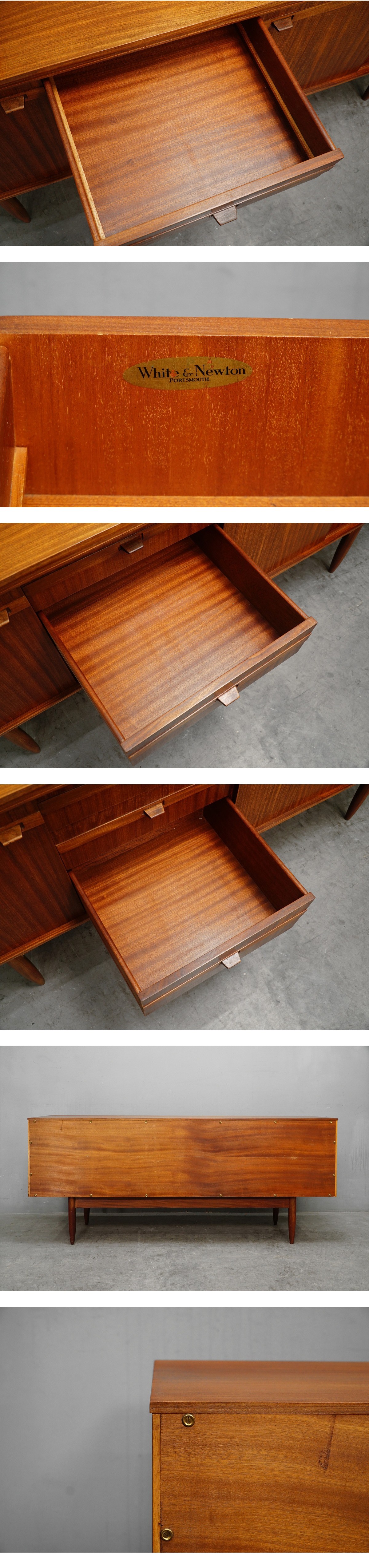 ◇英国 White&Newton(ホワイト&ニュートン)サイドボードキャビネットです。 White&Newton(ホワイト&ニュートン)はデンマークデザインを取り入れたG-PLANや、老舗メーカーA.H.McIntosh(A.H.マッキントッシュ)など、北欧スタイルの優秀な家具メーカーの一つです。ミッドセンチュリー期の英国の北欧スタイルの家具は、その品質とデザインで現在でも高く評価されています。 |