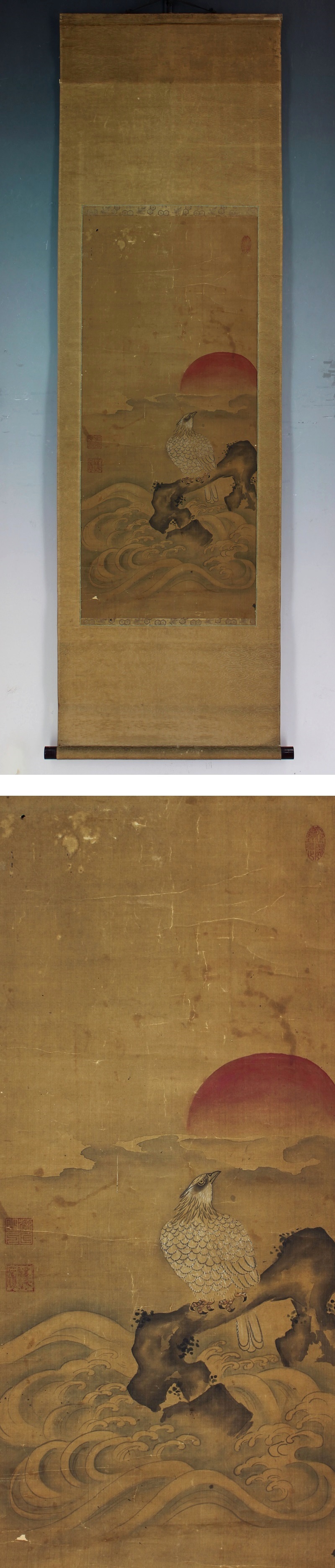 | №1903009【肉筆】在印【古画・鷹に日の出】◆絹本◆合箱◆掛軸 | |