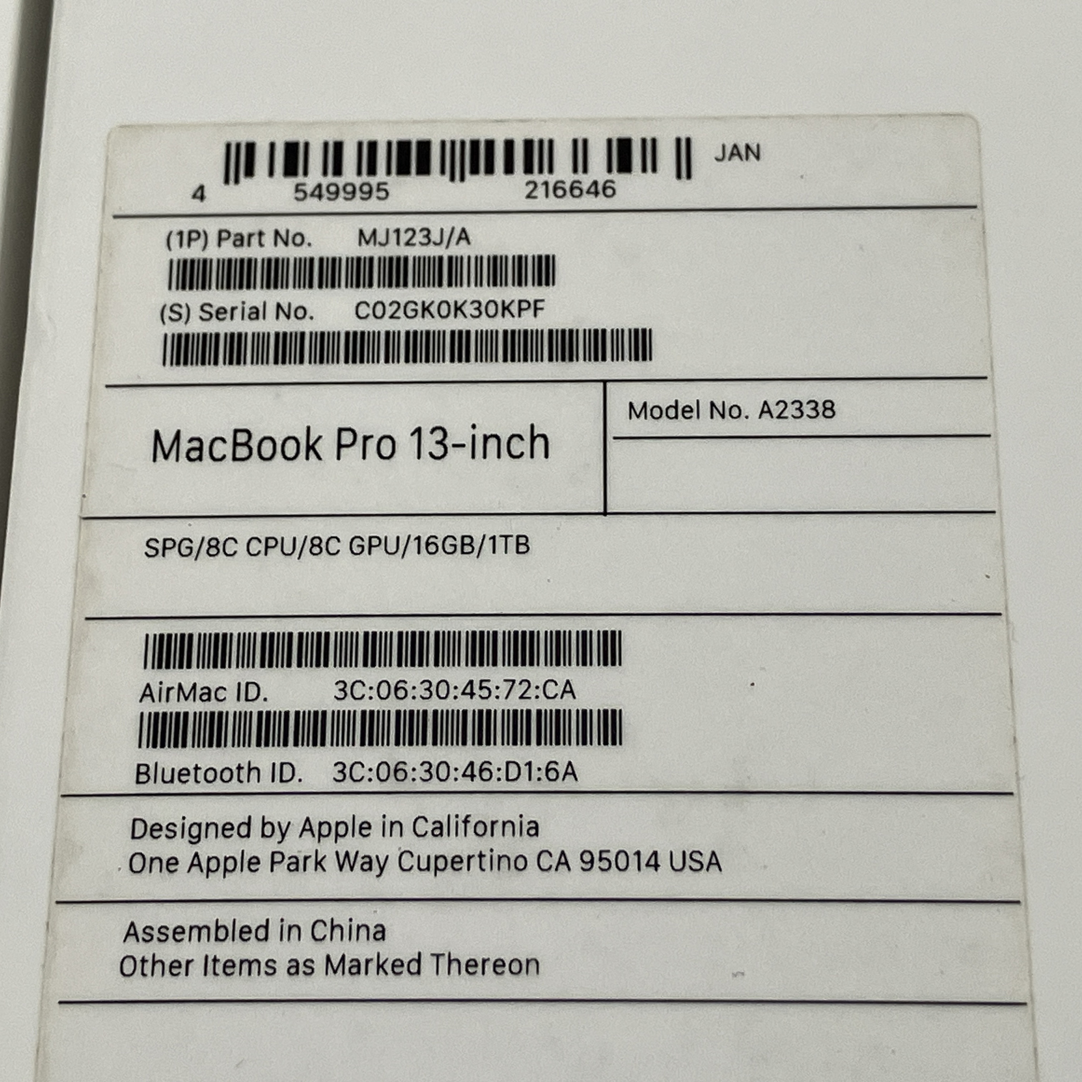 | シリーズ | MacBook Pro 13インチ M1 2020 | シリアル | C02GK0K30KPF |