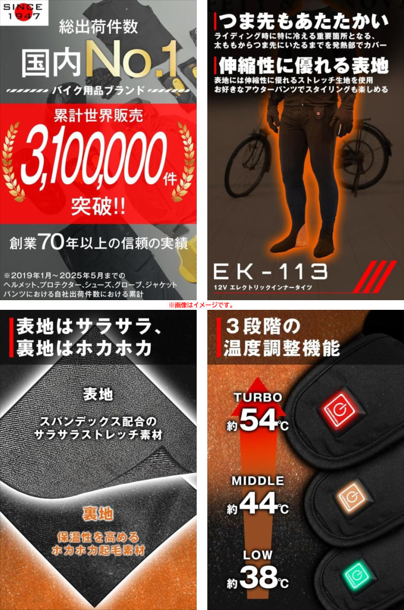 【商品特長】 車載12Vバッテリーより給電する電熱インナータイツ。 腿・膝・爪先にヒーターを内蔵し、冷えやすい下半身をしっかり温める。 伸縮性に優れ、腰から爪先までをカバーしながらも動きやすさ抜群。 車載バッテリーより給電するDC12V仕様。 | |||||||||||||
