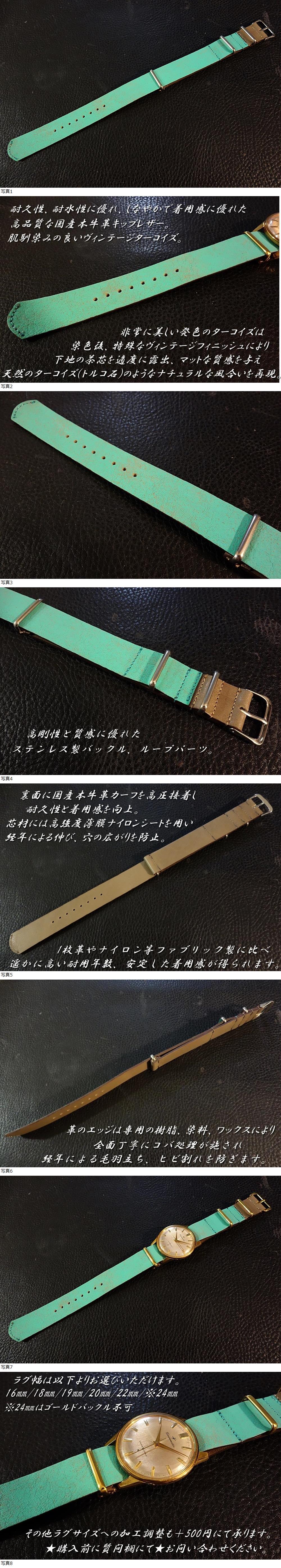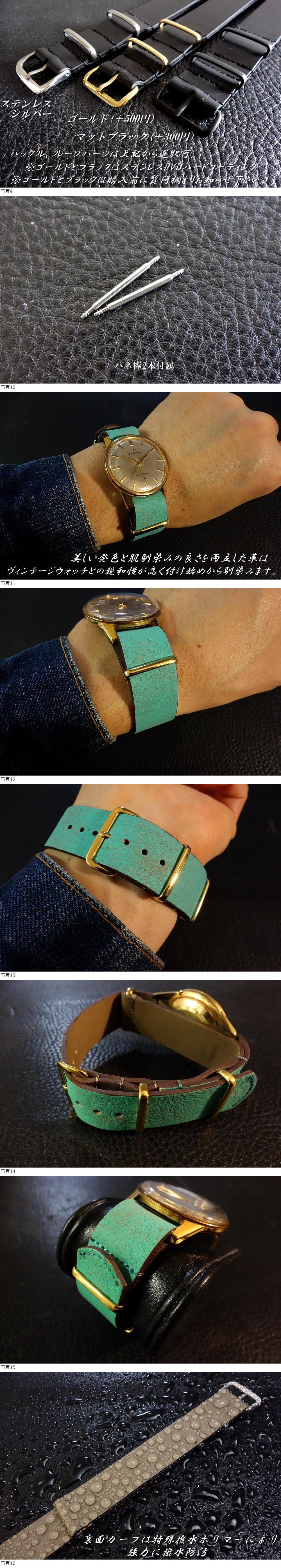 | ◆Leather NATO G10 Strap◆高品質国産本牛革キップレザー 茶芯ヴィンテージターコイズ カスタムオーダー(ラグ幅/バックルカラー) 日本製 受注製作(納期10日前後) |