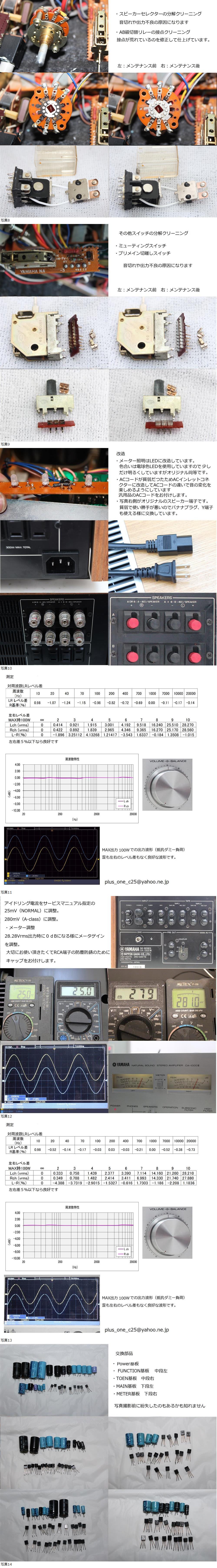 閲覧有難うございます。こちらの商品はYAMAHAのプリメイアンプ【CA-1000Ⅲ】のレストア整備済品です。 半年ほどコレクションとして徹底メンテナンスと不満点を改造して使っていましたが機器入替に伴い手放します。 (出品にあたり再整備と測定を実施しています) ・ACインレット化で電源ケーブルを交換可能としています。 ・使い勝手の悪いスピーカーターミナルをバナナプラグやY端子対応に交換。 ・RCA端子の簡易メッキ。(当初は金メッキにしたのですが、廉価品のためか接触不良が多発で変更) ・メータ照明をLEDに改造。 整備済み動作保証完動品ですので「届いたら故障していた」「直ぐに壊れた」と言う事があっても初期不良は送料出品者負担の無償修理に加え、3ヶ月間は送料を落札者様がご負担頂ければ無償修理致しますので安心して落札してください。 Sin波を入力しての出力波形をご覧いただければお判り頂ける様に、歪も左右のレベル差も殆ど無い様に整備した、正常に動作している個体です。 (波形上:Lチャンネル、波形下:Rチャンネル) タバコ臭は在りません 故障の際にも修理を承りますので安心してご落札ください。 (メールまたは質問欄から修理依頼をしていただければ承ります。落札機種以外他メーカー機種は要相談) CA-1000Ⅲは発売が1976年と数十年が経過しており整備なしにはまともな音は出ません。 電気部品には寿命が存在します。なかでも電解コンデンサは使用環境や条件によっても異なりますが、電解液が蒸発して劣化します。 交換すると多少なりとも音が変わってしまいますが、そのままの状態だといずれ音が出なくなってしまうので先を見越してブロックコンデンサ以外の全数を交換しています。 トランジスタについては寿命は半永久とは言っても実際にはパッケージと足の隙間から酸化が始まり内部へ至って劣化してしまうものがあります。 発売から数十年が経過した今でも問題ないものについては急に劣化してしまう可能性は低いですが。 また、この時代のトランジスタにはウイスカが起こるものがありノイズの発生やショートに至るためウイスカ該当品は無条件に交換しています。 計測器を使わなければ判らない程の歪や左右のレベル差の無いよう整備をすることは勿論、摘み磨きやメータ照明の交換といった外装にもこだわっています。 何日も費やして丁寧にメンテナンスを行い、特性測定値のエビデンスもある確かな個体ですので今後何年もご使用頂けると思います。 故障の際には修理を承りますので安心して落札ください。 整備をするにあたっては可能な限り当時の音をそのままに、オリジナルの状態を尊重しつつ今後も長くご使用できるよう心掛けています。 |