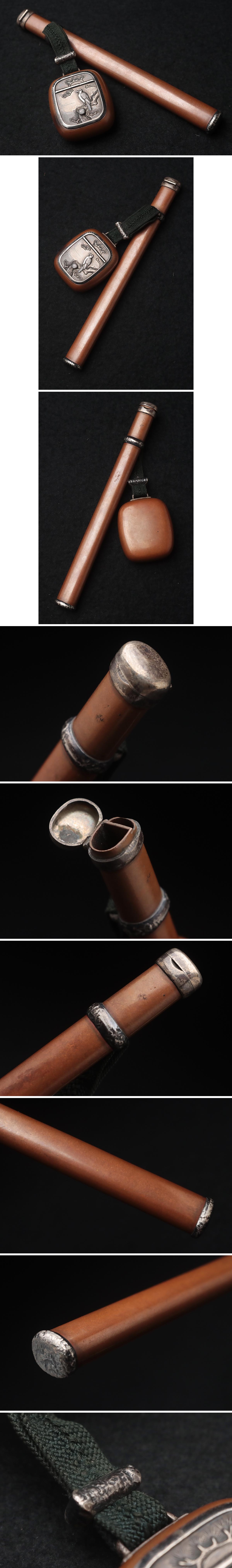 | ◆ 明治金工 銀金具/銀嵌松鷹図 銅矢立 総重69g・銀松鷹図銅分離形矢立 筆記具 携帯書道具 提げ物 古美術 ◆
