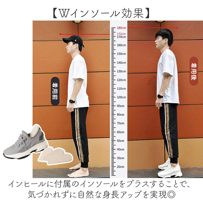 | 商品説明 | ・・【自然に身長アップ】 ・インヒールとインソールのW効果で、自然にスタイルアップが叶うスニーカー。 ・【Wインソール効果】 ・インヒールに付属のインソールをプラスすることで、気づかれずに自然な身長アップを実現する優秀アイテム◎ ・【ばれにくい設計】 ・もともと厚底デザインだから見た目は普通のスニーカー、シークレット感を感じさせない自然な仕上がり♪ ・【男女兼用デザイン】 ・シンプルでカジュアルなスタイルだから、男女問わず幅広いコーディネートに合わせやすく豊富なサイズ対応。 ・【メッシュで快適】 ・通気性の良いメッシュ素材を採用し、長時間履いても蒸れにくく快適な履き心地をキープしてくれる機能性〇 |