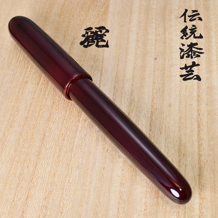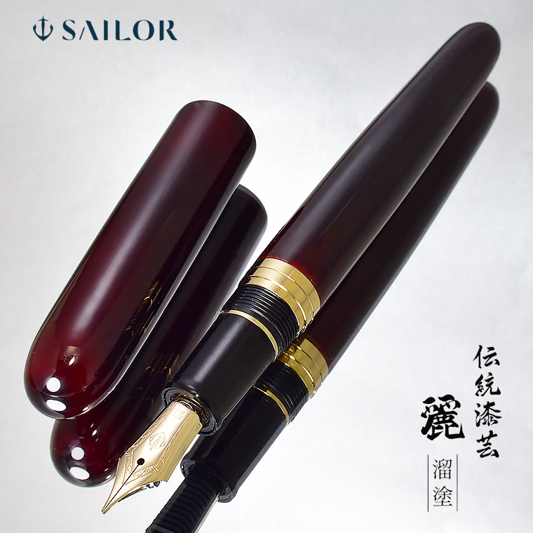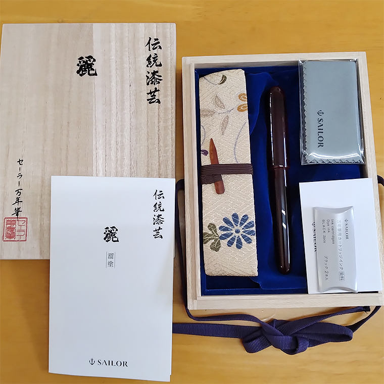 伝統漆芸 麗(れい)シリーズ 第一弾 輪島「溜塗」万年筆 全国各地の漆工を万年筆にする漆塗り万年筆シリーズ 新ニブタイプ M(中字)での出品 ![]() SAILOR/セーラー「伝統漆芸「麗」シリーズ 輪島 溜塗万年筆」をご紹介します。 「溜塗」は、朱塗りの表面に透明な漆(透き漆)を塗って仕上げたもので、 透き漆は、薄い茶褐色をした透明なため、透き漆を通して中塗りの色が にぶく落ち着いた色になり、深みが増し、使うほどに光沢が出てくる 漆塗りならではの優れた逸品です。 ![]() <伝統漆芸「麗」シリーズ> 漆塗りの調度品(漆器)の価値は奈良・平安時代、貴族社会の富の象徴、 神仏世界具現の麗美なものとして確立したとされます。 漆の語源とも云われる「麗(うるわし)」は、この上もなく美しいものを意味する言葉で、 日本の美の概念が 芽生え栄えたその時代ゆえ「漆」に「うるわしさ」を与える言葉として 漆に繋がっていったのは自然なことだともいえます。 日本の伝統の美しさや奥深さ、人に潤いと感動を与えるものとしての 「漆(漆器)」ゆえに、ペン軸始め付属の1本袋や桐箱に名高い真田紐と拘り、 すべて国産を意識し、伝統漆芸「麗」シリーズと名付けました。 ![]() 輪島 溜塗万年筆 輪島塗りは石川県、能登半島、輪島市の代表的な漆工芸で、伝統工芸品の一つです。 その歴史は古く平安から室町時代と云われています。 国内でも厳しい風土の輪島は、漆塗りに丈夫さを求め、創意工夫をし、 下地から上塗りまで数えきれないほどの手間をかけ生み出されたもので、 堅牢かつ優美 なものに進化させてきたことが輪島塗りの特徴と云えます。 輪島の漆文化の確立は、江戸時代前期頃と云われ、輪島塗は優れた漆器として 全国に知られていきました。他の漆産地でみることのできないほどの数多くの 工程があるため、輪島塗の漆塗りを修得するには時間がかかります。 その為、職人といわれる工人達は、代々伝わる先人達(親方)のもとで 時間をかけて修行することで、真摯な職人気質が育ち、優れた質の漆製品が誕生します。 ![]() 現在、輪島塗りは、国から伝統的工芸品として、技術は重要無形文化財として 指定されています。当製品に施されている溜塗りは、輪島在住で40年以上輪島塗りに 携わっている職人、隅祐智氏の作品です。 ![]() セーラーのペン芯は精密な機械で作り出され、ペン先の仕上げも万年筆職人により 1本1本厳しく検査された後、素晴らしい製品として送り出されるのです! ですから、どの万年筆も安定したインクフローと書き味を楽しむことができ、 この抜群の書き味は、一度味わってしまうと癖になりそうな逸品です。 しなやかな21金のニブは漢字のとめ・はね・はらいをきれいに表現してくれます。 セーラー万年筆の誇りが生きた書き味は、一度味わってしまうと癖になりそうな逸品です。 軸にはインクの耐食性に優れ、堅牢で狂いが少なく、使い込むほどにしっとりとした 感触の心地良さが感じられる「エボナイト材」を使用しています。 ![]() 付属物も日本製にこだわりました。 一本袋は、着物をほどいた生地を裁断し、一つ一つ手作りで仕上げております。 着物からとった上質な正絹の手ざわりは心地良く、すす竹から手作業で 削り出して作った爪も相まって、万年筆の収納に適した仕上がりです。 桐箱は漆製品の保管に最も適した素材と言われており、木目が細かく高品質な 国産桐を使用しております。結紐には千利休も茶道の道具箱に愛用したと いわれる伸びにくく丈夫な真田紐を使用しております。 この機会に、日本が誇る職人技術の粋を実感してみてください。 また、還暦や退職のお祝いなど、プレゼントにもお勧めです。 ![]() ********************************************************************** ≪詳細 【SAILOR/セーラー】伝統漆芸 麗(れい)輪島 溜塗万年筆 21金 10-8054-420≫ 出品個数 :1個 ペン先 : 21金・大型 サイズ : M(中字) 機構 : カートリッジ・コンバーター両用式 材質 : 蓋・胴:エボナイト、輪島溜塗 大先 :PMMA樹脂 長さ : 151mm 太さ : 17mm 重さ : 31.2g 付属品 :専用桐箱・ 真田紐 ・一本袋 ・クリーニングクロス カートリッジインク 2本・保証書・取扱説明書 本体価格 : 140,000円(税込154,000円) ※コンバーターは付属しません。 状態:新品未使用 ※気候や室内の温度変化、またセーラー出荷前の洗浄により、 ペン先に僅かな水滴がついている場合がございます。予めご了承ください。 ********************************************************************** |