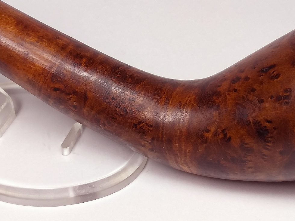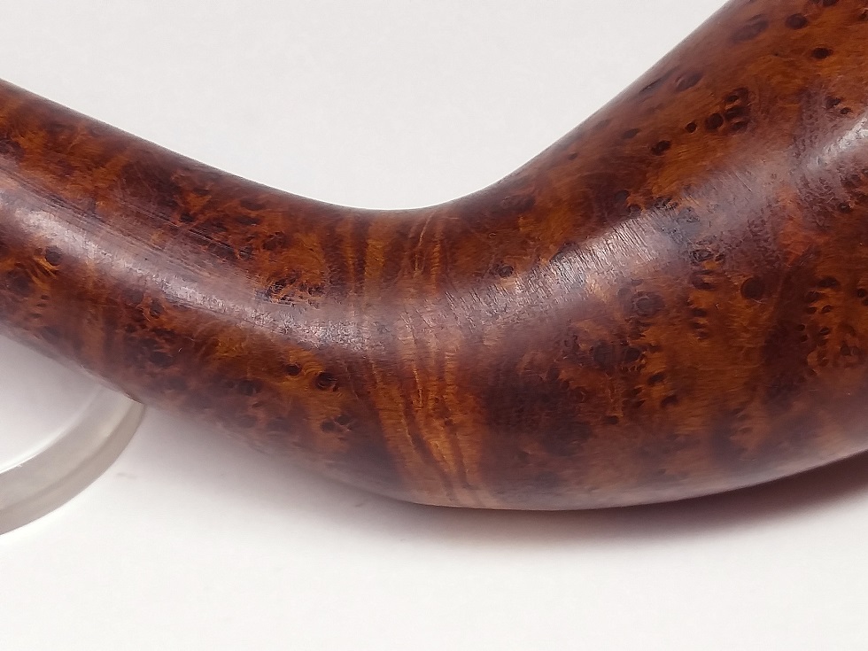 現在出品に使用の麻梨木根部無垢赤芯材老料瘤材の特徴は:①油性が、非常に良質で、②密度が最も高く、硬度が高く、成長速度が非常に遅くです。”鉄木”と呼ばれております。石のように硬いです。③色合いが、最極上の純正な赤茶色です。④重厚感が充分あります。水に入れると沈んでしまいます。⑤瘤材の紋理は、非常に綺麗です。⑥4、50年前に収蔵した老料瘤材を使用しておりますので、最高の熟成状態です!
