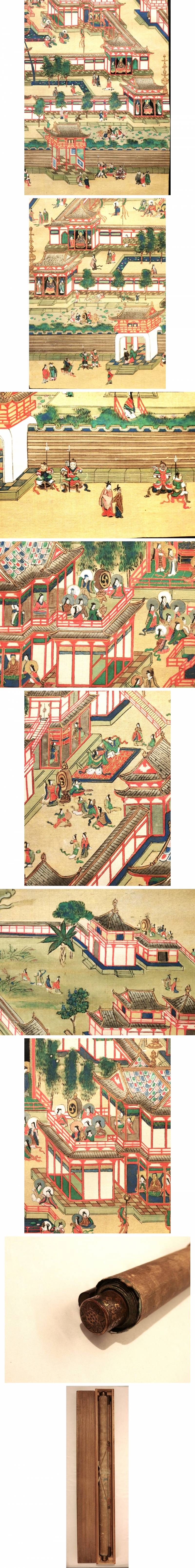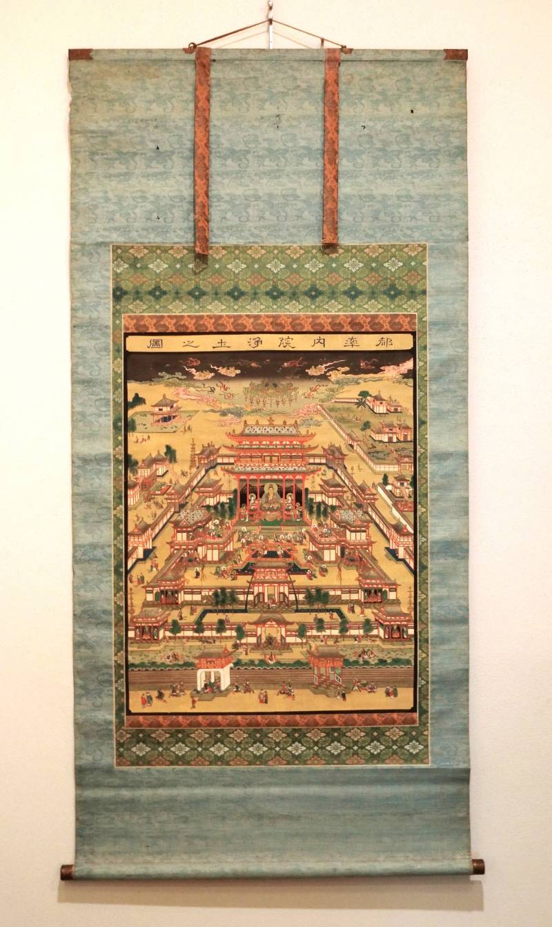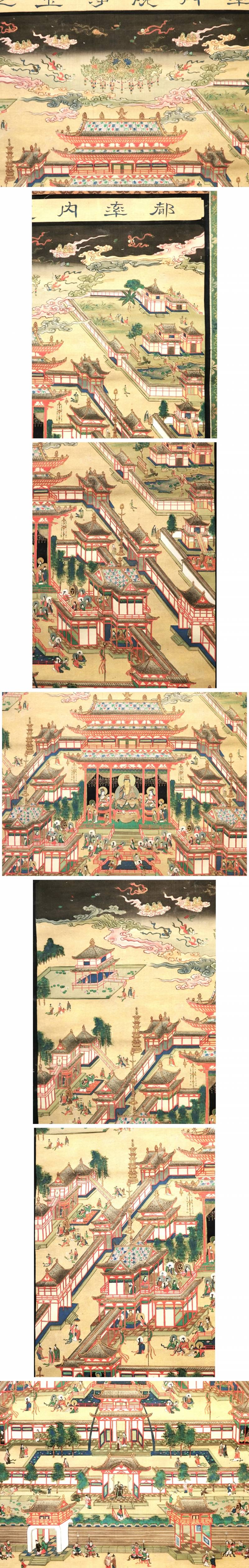 【都率内院浄土之図】須彌山の頂上二四万由旬の高所にある天で、歓楽に満たされており、天寿四千歳で、この天の一昼夜は人界の四百歳に当たるという。彌勒菩薩が住するとされ、彌勒の浄土といわれる。