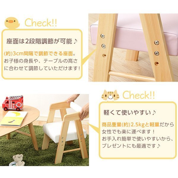 | 場所を取らないコンパクトサイズのキッズチェア! 丈夫な天然パイン材フレームで安心設計です。 座面は高さ調節可能でお手入れ簡単です。 カラーは3色展開です。 |