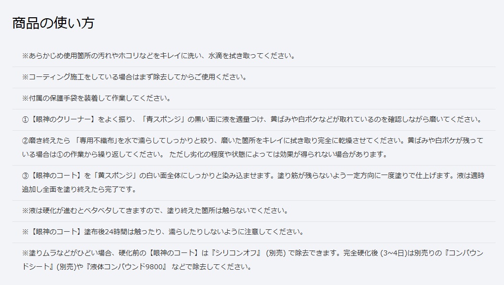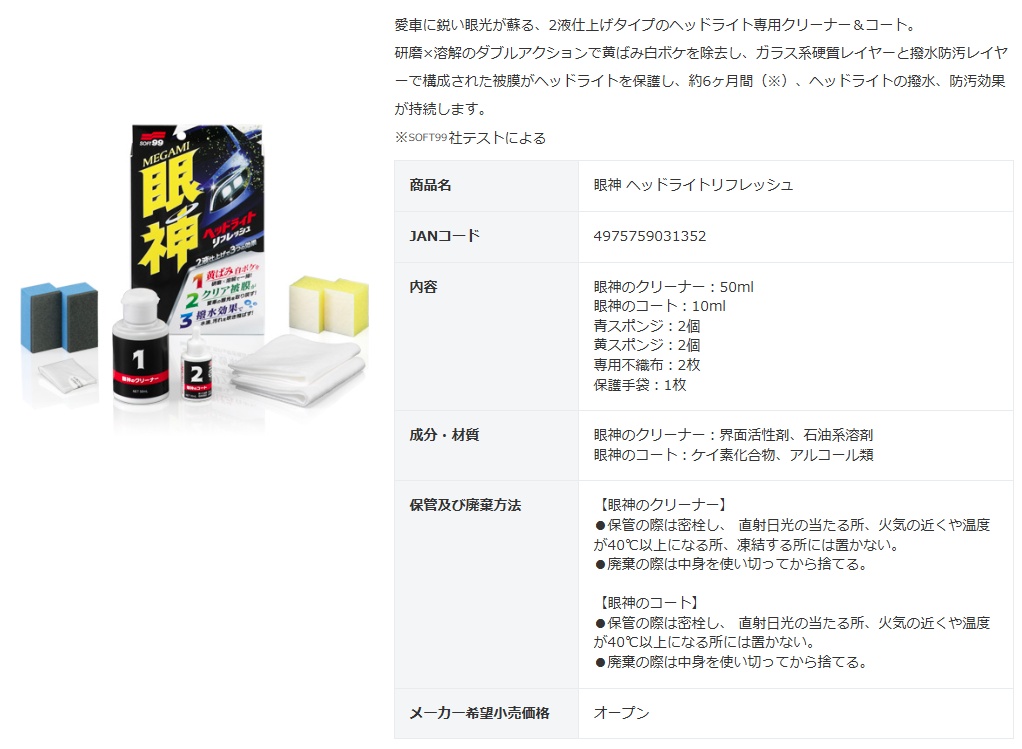 ソフト99 (SOFT99)眼神 ヘッドライトリフレッシュ商品コード:03135■特長愛車に鋭い眼光が蘇る、2液仕上げタイプのヘッドライト専用クリーナー&コート。研磨×溶解のダブルアクションで黄ばみ白ボケを除去し、ガラス系硬質レイヤーと撥水防汚レイヤーで構成された被膜がヘッドライトを保護し、約6ヶ月間(※)、ヘッドライトの撥水、防汚効果が持続します。※ソフト99社テストによる■内容・眼神のクリーナー:50ml・眼神のコート:10ml・青スポンジ:2個・黄スポンジ:2個・専用不織布:2枚・保護手袋:1枚■成分・材質・眼神のクリーナー:界面活性剤、石油系溶剤・眼神のコート:ケイ素化合物、アルコール類■保管及び廃棄方法【眼神のクリーナー】●保管の際は密栓し、 直射日光の当たる所、火気の近くや温度が40℃以上になる所、凍結する所には置かない。●廃棄の際は中身を使い切ってから捨てる。【眼神のコート】●保管の際は密栓し、 直射日光の当たる所、火気の近くや温度が40℃以上になる所には置かない。●廃棄の際は中身を使い切ってから捨てる。