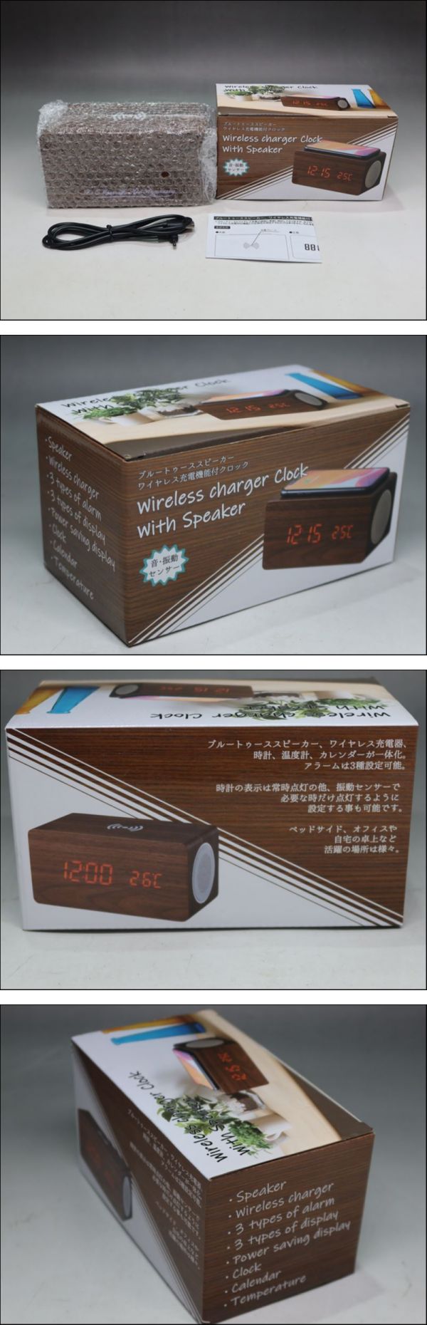 ブルートゥーススピーカー ワイヤレス充電機能付クロック 振動音センサー目覚まし 置時計 木目調 アラーム 未使用★保管品 | |||