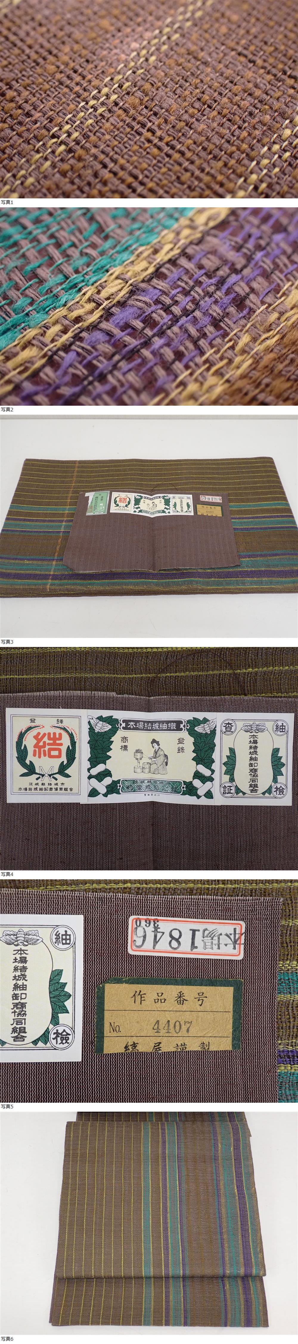逸品 正絹 結城紬 櫛織 袋帯 31.5cm×449cm 間道 渋色 つむぎ 証紙付 未使用 | ||||