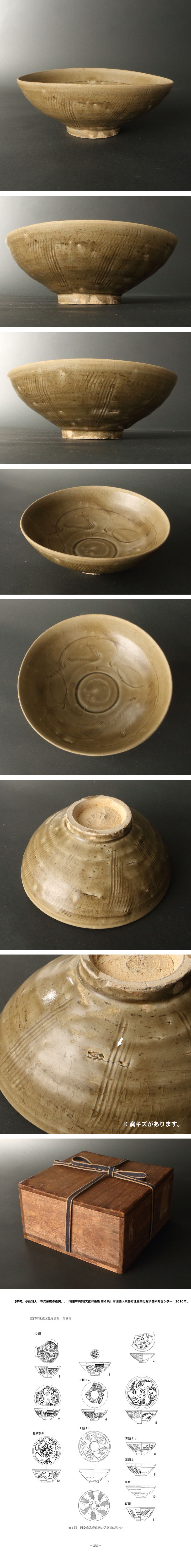 南宋の青磁鉢です。 同安窯(現・福建省)周辺で焼成された「猫掻手」と俗称される櫛目文を有する鉢です。平安末期、大宰府や博多に向け舶載されたもので、室町末期に珠光が博多近郊の土中から掘り出し愛玩した伝承から「珠光青磁」とも呼ばれ、千利休所持の珠光茶碗は一千貫文の高値が付き三好実休に譲られたことが『山上宗二記』に語られています。 こうした同安系青磁の再発見、そして熱狂は、応仁の乱勃発に伴う新興貿易都市・堺の台頭や、寧波の乱による日明貿易の一時的停滞を色濃く反映しており、それまで上級武士や禅宗寺院が競って珍蔵していた天目茶碗や砧青磁にはない「冷・凍・寂・古」の美学を体現する唐物として貴重視されたことが一因と考えられます(小山雅人「珠光茶碗の虚実 ―同安窯系青磁碗の系譜―」)。 利休の生きた時代の、三好一族と堺を取り巻く「下剋上」の時代精神を体現し、のちの高麗や桃山陶評価への端緒を切り開いたといえる逸品です。 付属:時代箱が付属します。 寸法:高さ6.5cm、幅16.5cm(最大幅。若干の誤差はご了承下さい) 状態:経年感、口部全体に直し、複数カマキズ、釉薬ハゲがございます。 |