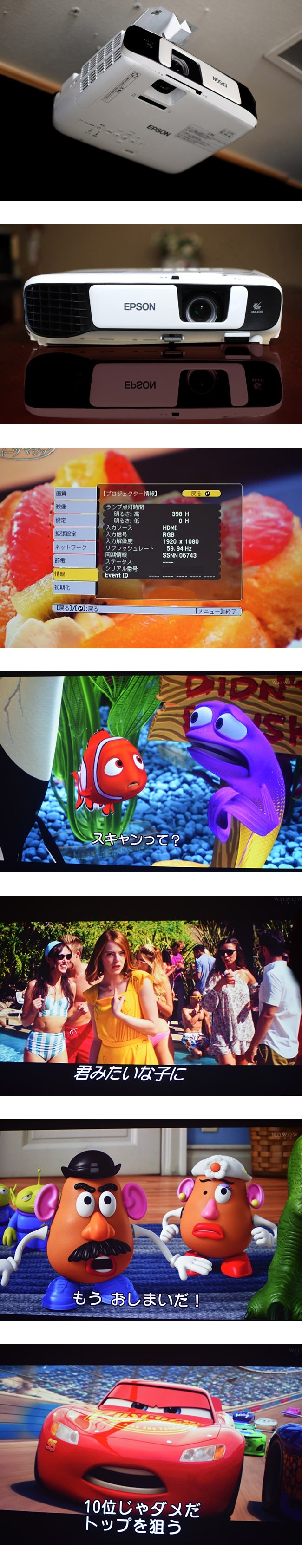 色彩鮮やかに濃密な映像が映し出されています。3600ルーメンの高輝度はさすがに明るくスクリーン全体に力強さがあり、部屋の照明下でも高い視認性があります。細部表現力や階調表現力も秀逸で、低照度シーンの微妙な陰影表現から高輝度シーンのハイライト表現までEPSON 3LCDらしい濃密な色彩で描き分けているのがわかり、彩度の高い映像で色純度の高さが印象的です。実写映像は添付写真をご覧ください(120インチホワイトマットスクリーンに当出品機で実際に投射した映像です)。
