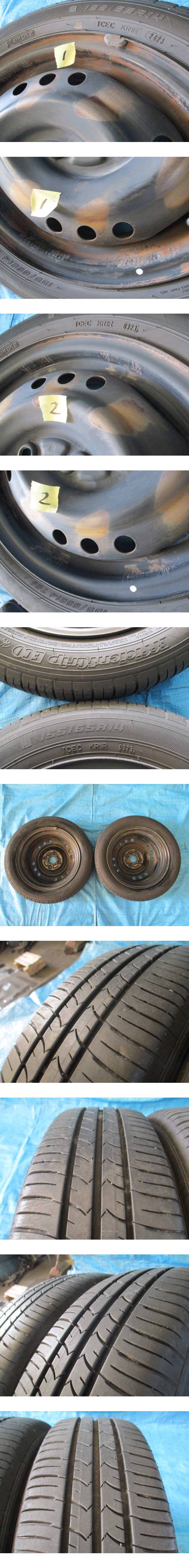 ※下記情報をよくご確認いただいたうえで入札してください。 弊社では「まとめて取引」への対応は行なっておりません。 同梱をご希望の場合はご入札前にご質問下さい。 同梱可能な商品の場合は対応いたします。 また、質問や連絡等なくまとめて購入を選択・決済をされた場合は別途追加の送料をいただくことがあります。 営業日15時までの入金確認で即日発送できます。 日曜日、第2・第4土曜日、祝祭日はお休みを頂いてます。 ■取り外し車両 ●認定型式=DBA-L375S(ダイハツ タント) ●フル型式=L375SGBDF ●年式=2012/03 ●車体番号=0525*** ●走行距離=117,699km ●エンジン型式=KF-VE ●ミッション=CVT ●型式指定/類別区分=16010/0028 ●グレード=L ●駆動=2WD ■詳細 ・上記車両からの取り外しです。 ・タイヤ付ホイール2本の出品です。 ●タイヤ サイズ 155/65R14 メーカー/銘柄 GOODYEAR(グッドイヤー) Efficient Grip(エフィシェントグリップ) ECO Hybrid 製造年週 2023年03週 2023年24週 残溝 2本とも8分山程度 ●ホイール L375タント 純正スチール(ブラック) サイズ 14×4.5J ハブ径54mm 4H PCD100 ■状態 ●タイヤ 片べりやパンク修理等なく問題なくご使用いただけると思います。 ●ホイール ②リムにキズが少しあります。 その他2本ともに、ホイールキャップ跡、ダスト汚れあります。 曲がりや変形はありません。 ・気持ち良くお使い頂く為、出来る限りの掃除はしています。 ※当方で自動車部品を出品していますので、よろしければ下記のURLよりご覧ください。 team818ys出品リスト⇒https://auctions.yahoo.co.jp/seller/team818ys ■在庫管理番号 2500752-1 ■送料 (元払いのみの対応)運送会社の選択はできません。 [ 北海道 ] 2730円 (北海道) [ 東北 ] 2310円 (青森、岩手、秋田、山形、宮城、福島) [ 関東 ] 2100円 (茨城、栃木、群馬、埼玉、千葉、東京、神奈川、山梨、新潟、長野) [ 中部 ] 2000円 (静岡、愛知、岐阜、三重、富山、石川、福井) [ 関西 ] 1890円 (滋賀、京都、大阪、兵庫、奈良、和歌山) [ 中国 ] 1890円 (鳥取、岡山、島根、広島、山口) [ 四国 ] 1790円 (香川、徳島、愛媛、高知) [ 九州 ] 1890円 (福岡、佐賀、長崎、熊本、大分、宮崎、鹿児島) 沖縄県・離島の方は送料をお問合せ下さい。 最後までご覧頂き有難うございました。ご検討宜しくお願い致します。 | ||||