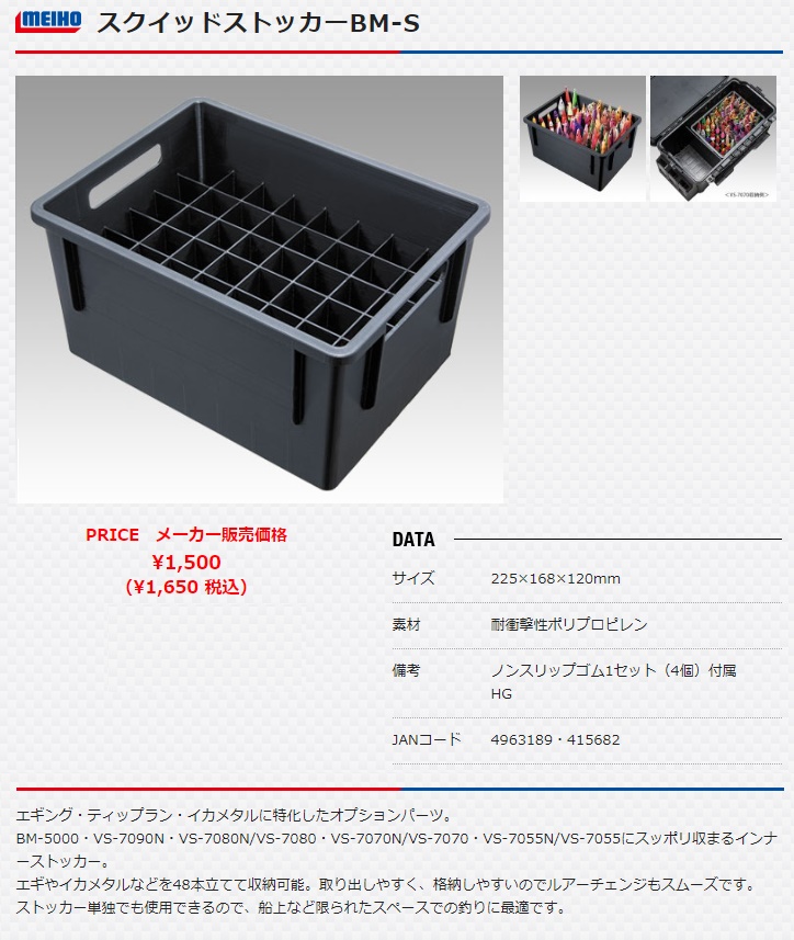 メイホー MEIHO Fishingスクイッドストッカー BM-S■特長エギング・ティップラン・イカメタルに特化したオプションパーツ。BM-5000・VS-7090N・VS-7080N/VS-7080・VS-7070N/VS-7070・VS-7055N/VS-7055にスッポリ収まるインナーストッカー。エギやイカメタルなどを48本立てて収納可能。取り出しやすく、格納しやすいのでルアーチェンジもスムーズです。ストッカー単独でも使用できるので、船上など限られたスペースでの釣りに最適です。■DATA・サイズ:225×168×120mm・素材:耐衝撃性ポリプロピレン・備考:ノンスリップゴム1セット(4個)付属 HG