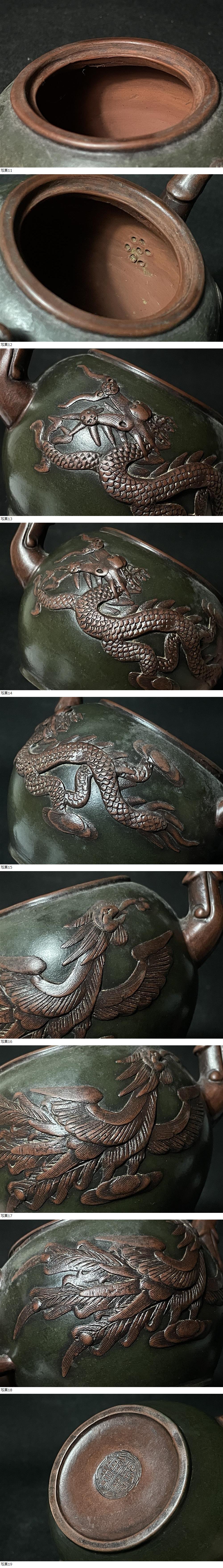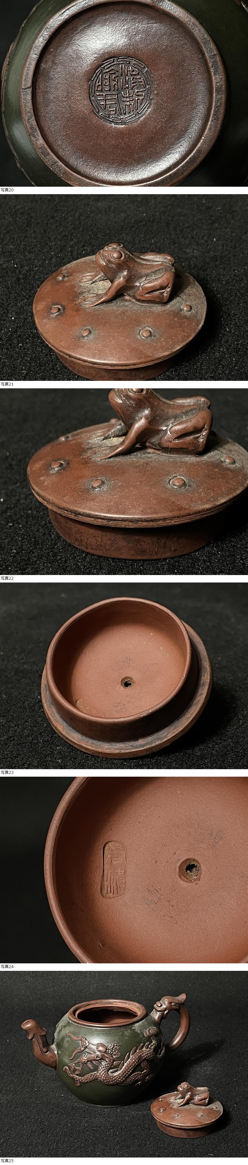 | 中国古玩 朱泥浮彫龍鳳凰刻蛙摘急須 在銘 蓋銘 紫砂 茶壺 時代 |