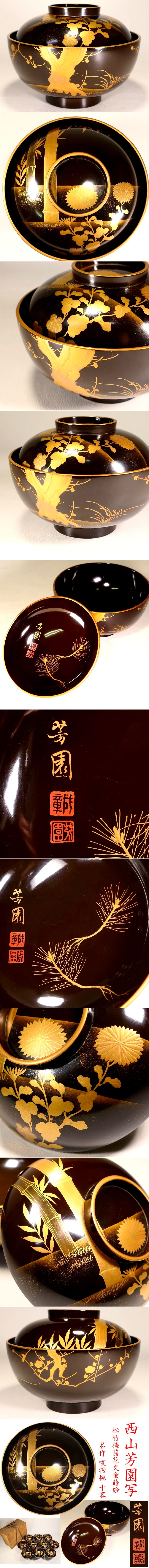 | 商品説明 | ~寸法~ 直径 約 13.2cm×高さ 約 9.6cm 煌びやかな金蒔絵により 「(西山)芳園」写しの極上「松竹梅菊花文」 が施された名作「吸物椀」です。 上品な雰囲気が漂う美しいお品でございます。 この機会に是非手に入れて下さい。 保管箱がございます。 大切にして頂ける方の元へ届けば幸いでございます。 ~状態~ 全体的に見て状態は概ね良好です。 経年による多少の小キズくらいはございますが、 大きく鑑賞を損なうことはないと思われます。 画像にてご確認下さい。 許容範囲内の時代傷みはご理解下さい。 |